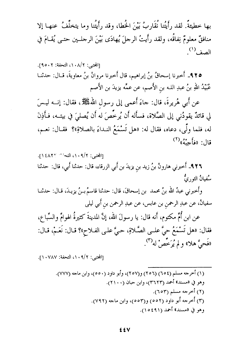 926 - أَخْبَرَنِي هَارُونُ بْنُ زَيْدِ بْنِ يَزِيدَ بْنِ أَبِي الزَّرْقَاءِ، قَالَ: حَدَّثَنَا أَبِيُ قَالَ: حَدَّثَنَا سُفْيَانُ الثَّوْرِيُّ، وَأَخْبَرَنِي عَبْدُ اللهِ بْنُ مُحَمَّدِ بْنِ إِسْحَاقَ قَالَ: حَدَّثَنَا قَاسِمُ بْنُ يَزِيدَ قَالَ: حَدَّثَنَا سُفْيَانُ، عَنْ عَبْدِ الرَّحْمَنِ بْنِ عَابِسٍ، عَنْ عَبْدِ الرَّحْمَنِ بْنِ أَبِي لَيْلَى، عَنِ ابْنِ أُمِّ مَكْتُومٍ أَنَّه قَالَ: " يَا رَسُولَ اللهِ إِنَّ الْمَدِينَةَ كَثِيرَةَ الْهَوَامِّ وَالسِّبَاعِ، فَقَالَ: «§هَلْ تَسْمَعُ حَيَّ عَلَى الصَّلَاةِ، حَيَّ عَلَى الْفَلَاحِ»، قَالَ: نَعَمْ، قَالَ: «فَحَيَّ هَلًا» وَلَمْ يُرَخَّصْ لَهُ