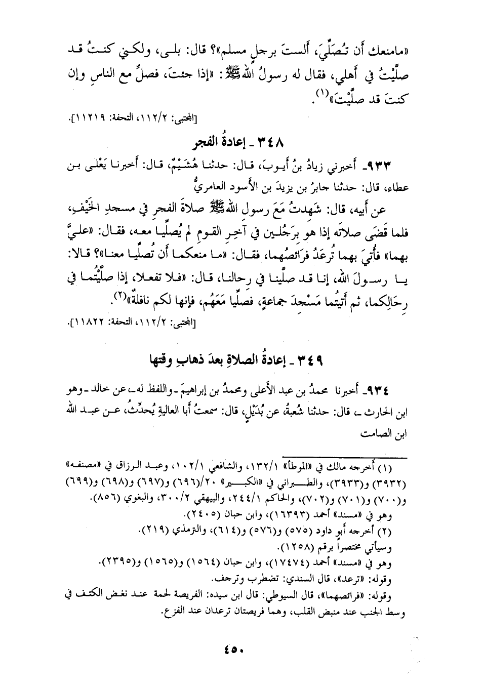 933 - أَخْبَرَنِي زِيَادُ بْنُ أَيُّوبَ قَالَ: حَدَّثَنَا هُشَيْمُ قَالَ: أَخْبَرَنَا يَعْلَى بْنُ عَطَاءٍ قَالَ: حَدَّثَنَا جَابِرُ بْنُ يَزِيدَ بْنِ الْأَسْوَدِ الْعَامِرِيُّ، عَنْ أَبِيهِ، قَالَ: شَهِدْتُ مَعَ رَسُولِ اللهِ صَلَّى اللهُ عَلَيْهِ وَسَلَّمَ صَلَاةَ الْفَجْرِ فِي مَسْجِدِ الْخَيْفِ فَلَمَّا قَضَى صَلَاتَهُ إِذَا هُوَ بِرَجُلَيْنِ فِي آخِرِ الْقَوْمِ لَمْ يُصَلِّيَا مَعَهُ، فَقَالَ: «عَلَيَّ بِهِمَا»، فَأُتِيَ بِهِمَا تُرْعَدُ فَرَائِصُهُمَا، فَقَالَ: «مَا مَنَعَكُمَا أَنْ تُصَلِّيَا مَعَنَا؟» قَالَا: يَا رَسُولَ اللهِ، إِنَّا قَدْ صَلَّيْنَا فِي رِحَالِنَا، قَالَ: «فَلَا تَفْعَلَا، §إِذَا صَلَّيْتُمَا فِي رِحَالِكُمَا، ثُمَّ أَتَيْتُمَا مَسْجِدَ جَمَاعَةٍ فَصَلَّيَا مَعَهُمْ فَإِنَّهَا لَكُمْ نَافِلَةٌ»