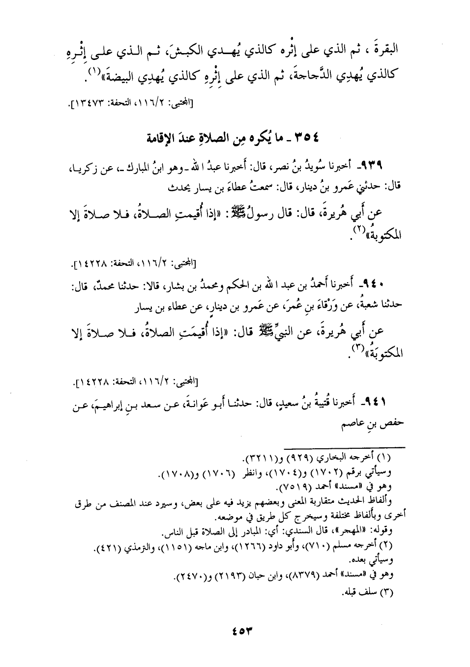 939 - أَخْبَرَنَا سُوَيْدُ بْنُ نَصْرٍ قَالَ: أَخْبَرَنَا عَبْدُ اللهِ، وَهُوَ ابْنُ الْمُبَارَكِ، عَنْ زَكَرِيَّا قَالَ: حَدَّثَنِي عَمْرُو بْنُ دِينَارٍ قَالَ: سَمِعْتُ عَطَاءَ بْنَ يَسَارٍ يُحَدِّثُ، عَنْ أَبِي هُرَيْرَةَ قَالَ: قَالَ رَسُولُ اللهِ صَلَّى اللهُ عَلَيْهِ وَسَلَّمَ: «§إِذَا أُقِيمَتِ الصَّلَاةُ، فَلَا صَلَاةَ إِلَّا الْمَكْتُوبَةَ»