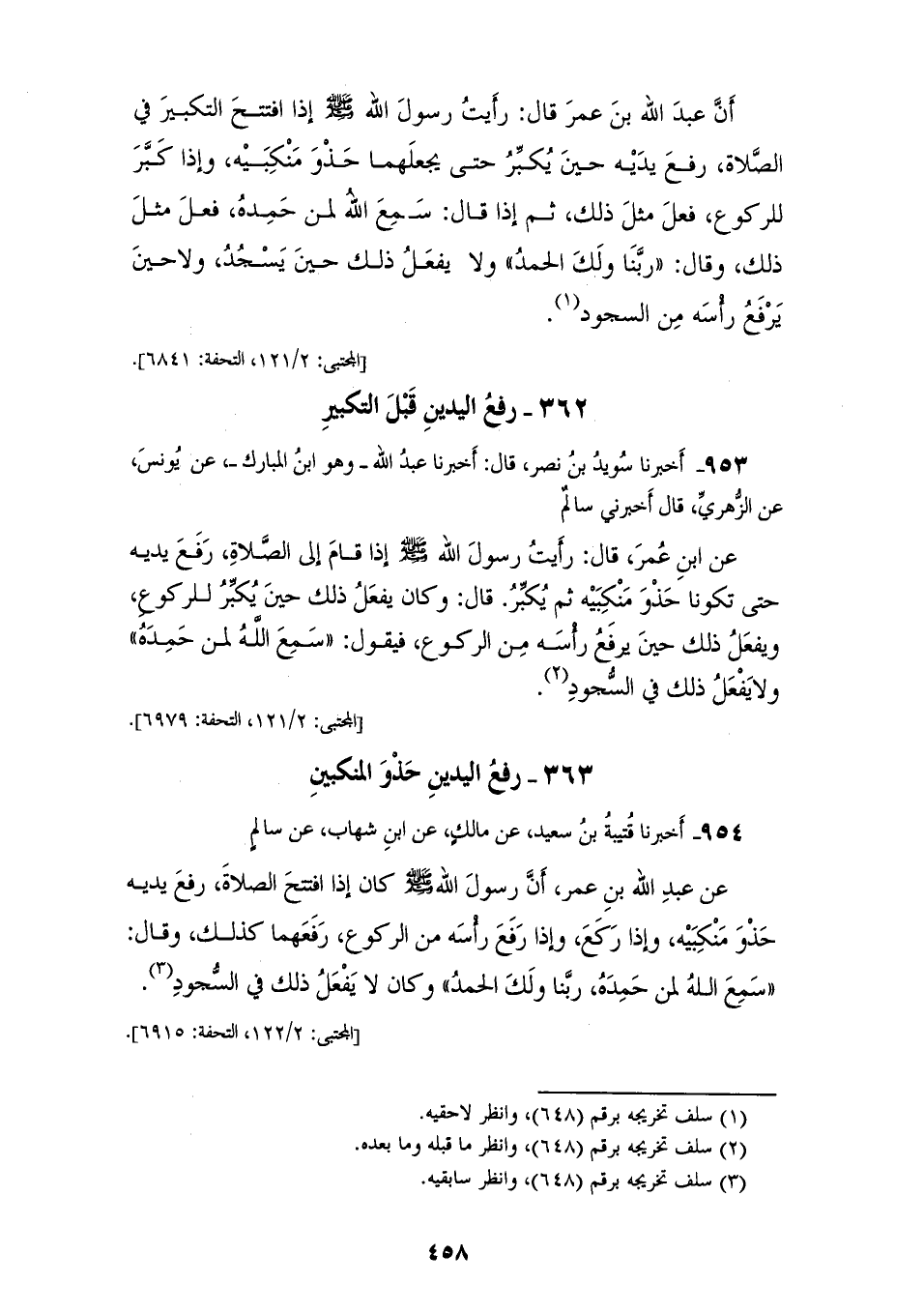 954 - أَخْبَرَنَا قُتَيْبَةُ بْنُ سَعِيدٍ، عَنْ مَالِكٍ، عَنِ ابْنِ شِهَابٍ، عَنْ سَالِمٍ، عَنْ عَبْدِ اللهِ بْنِ عُمَرَ أَنَّ رَسُولَ اللهِ صَلَّى اللهُ عَلَيْهِ وَسَلَّمَ كَانَ §إِذَا افْتَتَحَ الصَّلَاةَ رَفَعَ يَدَيْهِ حَذْوَ مَنْكِبَيْهِ، وَإِذَا رَكَعَ، وَإِذَا رَفَعَ رَأْسَهُ مِنَ الرُّكُوعِ رَفَعَهُمَا كَذَلِكَ، وَقَالَ: «سَمِعَ اللهُ لِمَنْ حَمِدَهُ رَبَّنَا وَلَكَ الْحَمْدُ». وَكَانَ لَا يَفْعَلُ ذَلِكَ فِي السُّجُودِ