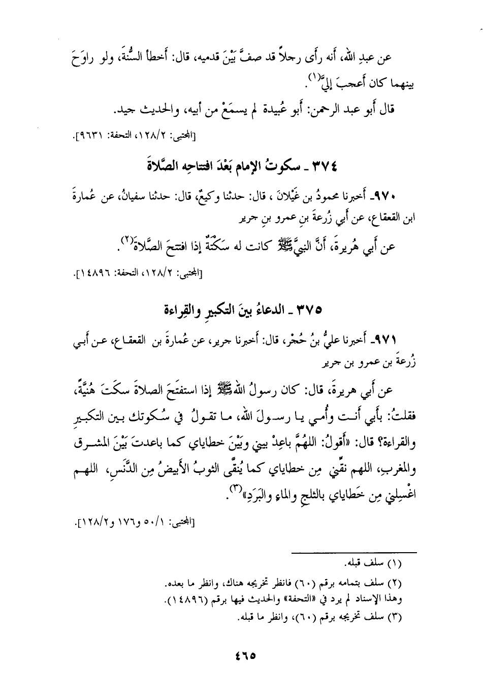 970 - أَخْبَرَنَا مَحْمُودُ بْنُ غَيْلَانَ قَالَ: حَدَّثَنَا وَكِيعٌ قَالَ: حَدَّثَنَا سُفْيَانُ، عَنْ عُمَارَةَ بْنِ الْقَعْقَاعِ، عَنْ أَبِي زُرْعَةَ بْنِ عَمْرِو بْنِ جَرِيرٍ، عَنْ أَبِي هُرَيْرَةَ أَنَّ النَّبِيَّ صَلَّى اللهُ عَلَيْهِ وَسَلَّمَ، §كَانَتْ لَهُ سَكْتَةٌ إِذَا افْتَتَحَ الصَّلَاةَ "