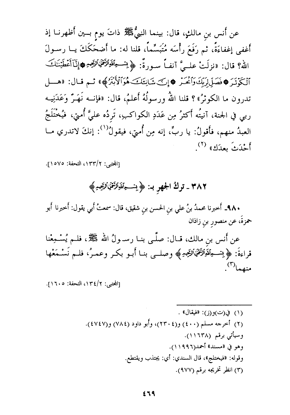 979 - أَخْبَرَنَا عَلِيُّ بْنُ حُجْرٍ قَالَ: أَخْبَرَنَا عَلِيُّ بْنُ مُسْهِرٍ، عَنِ الْمُخْتَارِ بْنِ فُلْفُلٍ، عَنْ أَنَسِ بْنِ مَالِكٍ قَالَ: بَيْنَمَا النَّبِيُّ صَلَّى اللهُ عَلَيْهِ وَسَلَّمَ ذَاتَ يَوْمٍ بَيْنَ أَظْهُرِنَا، إِذْ أَغْفَى إِغْفَاءَةً، ثُمَّ رَفَعَ رَأْسَهُ مُتَبَسِّمًا، قُلْنَا لَهُ: مَا أَضْحَكَكَ يَا رَسُولَ اللهِ؟، قَالَ: " §نَزَلَتْ عَلَيَّ آنِفًا سُورَةٌ: بِسْمِ اللهِ الرَّحْمَنِ الرَّحِيمِ إِنَّا أَعْطَيْنَاكَ الْكَوْثَرَ، فَصَلِّ لِرَبِّكَ وَانْحَرْ، إِنَّ شَانِئَكَ هُوَ الْأَبْتَرُ " ثُمَّ قَالَ: «هَلْ تَدْرُونَ مَا الْكَوْثَرُ؟» قُلْنَا: اللهُ وَرَسُولُهُ أَعْلَمُ، قَالَ: " فَإِنَّهُ نَهَرٌ وَعَدَنِيهِ رَبِّي فِي الْجَنَّةِ، آنِيَتُهُ أَكْثَرُ مِنْ عَدَدِ الْكَوَاكِبِ، تَرِدْهُ عَلَيَّ أُمَّتِي فَيُخْتَلَجُ الْعَبْدُ مِنْهُمْ، فَأَقُولُ: يا رَبِّ إِنَّهُ مِنْ أُمَّتِي، فَيَقُولُ: إِنَّكَ لَا تَدْرِي مَا أَحْدَثَ بَعْدَكَ "