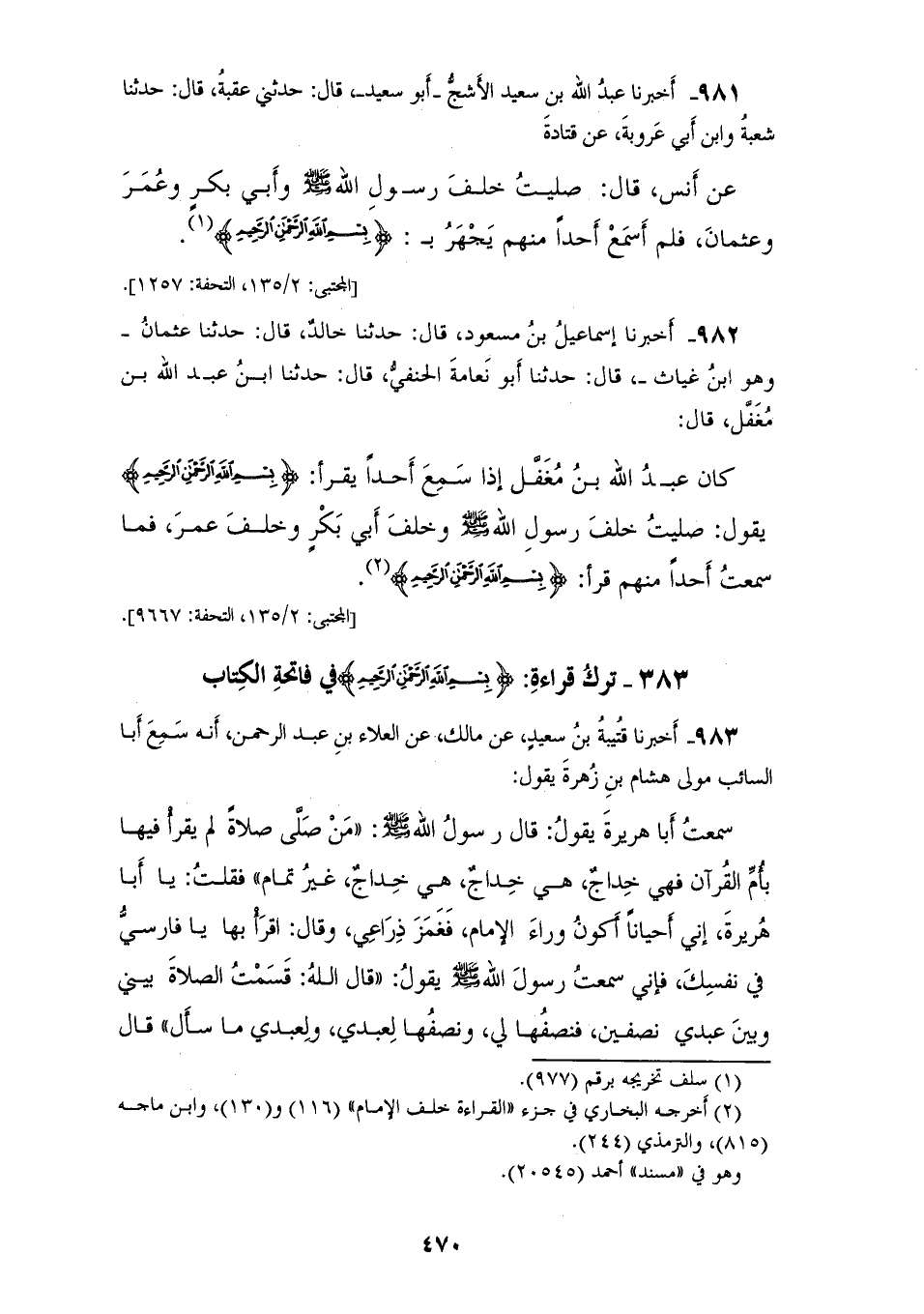 982 - أَخْبَرَنَا إِسْمَاعِيلُ بْنُ مَسْعُودٍ قَالَ: حَدَّثَنَا خَالِدٌ قَالَ: حَدَّثَنَا عُثْمَانُ وَهُوَ ابْنُ غِيَاثٍ قَالَ: حَدَّثَنَا أَبُو نَعَامَةَ الْحَنَفِيُّ قَالَ: حَدَّثَنَا ابْنُ عَبْدِ اللهِ بْنِ مُغَفَّلٍ قَالَ: كَانَ عَبْدُ اللهِ بْنُ مُغَفَّلٍ، إِذَا سَمِعَ أَحَدًا يَقْرَأُ: بِسْمِ اللهِ الرَّحْمَنِ الرَّحِيمِ، يَقُولُ: «§صَلَّيْتُ خَلْفَ رَسُولِ اللهِ صَلَّى اللهُ عَلَيْهِ وَسَلَّمَ، وَخَلْفَ أَبِي بَكْرٍ، وَخَلْفَ عُمَرَ، فَمَا سَمِعْتُ أَحَدًا مِنْهُمْ قَرَأَ بِسْمِ اللهِ الرَّحْمَنِ الرَّحِيمِ»