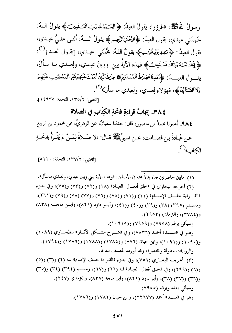 983 - أَخْبَرَنَا قُتَيْبَةُ بْنُ سَعِيدٍ، عَنْ مَالِكٍ، عَنِ الْعَلَاءِ بْنِ عَبْدِ الرَّحْمَنِ، أَنَّهُ سَمِعَ أَبَا السَّائِبِ، مَوْلَى هِشَامِ بْنِ زُهْرَةَ يَقُولُ: سَمِعْتُ أَبَا هُرَيْرَةَ يَقُولُ: قَالَ رَسُولُ اللهِ صَلَّى اللهُ عَلَيْهِ وَسَلَّمَ: «مَنْ صَلَّى صَلَاةً لَمْ يَقْرَأْ فِيهَا، بِأُمِّ الْقُرْآنِ فَهِيَ خِدَاجٌ، هِيَ خِدَاجٌ، هِيَ خِدَاجٌ غَيْرُ تَمَامٍ»، فَقُلْتُ: يَا أَبَا هُرَيْرَةَ، إِنِّي أَحْيَانًا أَكُونُ وَرَاءَ الْإِمَامِ، فَغَمَزَ ذِرَاعِي، وَقَالَ: اقْرَأْ بِهَا يَا فَارِسِيُّ فِي نَفْسِكَ، فَإِنِّي سَمِعْتُ رَسُولَ اللهِ صَلَّى اللهُ عَلَيْهِ وَسَلَّمَ، يَقُولُ: " قَالَ اللهُ: قَسَمْتُ الصَّلَاةَ بَيْنِي وَبَيْنَ عَبْدِي نِصْفَيْنِ، فَنِصْفُهَا لِي، وَنِصْفُهَا لِعَبْدِي، وَلِعَبْدِي، مَا سَأَلَ "، قَالَ رَسُولُ اللهِ صَلَّى اللهُ عَلَيْهِ وَسَلَّمَ: " اقْرَءُوا يَقُولُ الْعَبْدُ: {§الْحَمْدُ لِلَّهِ رَبِّ الْعَالَمِينَ} [الفاتحة: 2]، يَقُولُ اللهُ: حَمِدَنِي عَبْدِي.، يَقُولُ الْعَبْدُ: {الرَّحْمَنِ الرَّحِيمِ} [الفاتحة: 1]، يَقُولُ اللهُ: أَثْنَى عَلَيَّ عَبْدِي. يَقُولُ الْعَبْدُ: {مَالِكِ يَوْمِ الدِّينِ} يَقُولُ اللهُ: مَجَّدَنِي عَبْدِي، يَقُولُ الْعَبْدُ: {إِيَّاكَ نَعْبُدُ وَإِيَّاكَ نَسْتَعِينُ} [الفاتحة: 5] فَهَذِهِ الْآيَةُ بَيْنِي وَبَيْنَ عَبْدِي، وَلِعَبْدِي مَا سَأَلَ، يَقُولُ الْعَبْدُ: {اهْدِنَا الصِّرَاطَ الْمُسْتَقِيمَ، صِرَاطَ الَّذِينَ أَنْعَمْتَ عَلَيْهِمْ، غَيْرِ الْمَغْضُوبِ عَلَيْهِمْ، وَلَا الضَّالِّينَ} [الفاتحة: 7] فَهَؤُلَاءِ لِعَبْدِي، وَلِعَبْدِي مَا سَأَلَ "