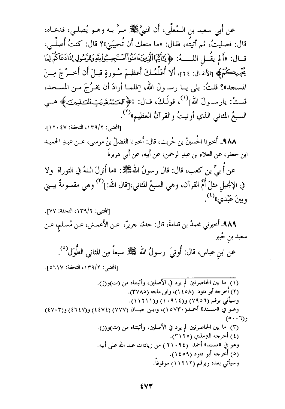 987 - أَخْبَرَنَا إِسْمَاعِيلُ بْنُ مَسْعُودٍ قَالَ: حَدَّثَنَا خَالِدٌ قَالَ: حَدَّثَنَا شُعْبَةُ، عَنْ خُبَيْبِ بْنِ عَبْدِ الرَّحْمَنِ قَالَ: سَمِعْتُ حَفْصَ بْنَ عَاصِمٍ، يُحَدِّثُ، عَنْ أَبِي سَعِيدِ بْنِ الْمُعَلَّى، أَنَّ النَّبِيَّ صَلَّى اللهُ عَلَيْهِ وَسَلَّمَ مَرَّ بِهِ وَهُوَ يُصَلِّي، فَدَعَاهُ، قَالَ: فَصَلَّيْتُ ثُمَّ أَتَيْتُهُ، فَقَالَ: «مَا مَنَعَكَ أَنْ تُجِيبَنِي؟» قُلْتُ: كُنْتُ أُصَلِّي.، قَالَ: أَلَمْ يَقُلِ اللهُ: {يَا أَيُّهَا الَّذِينَ آمَنُوا اسْتَجِيبُوا لِلَّهِ، وَلِلرَّسُولِ، إِذَا دَعَاكُمْ لَمَّا يُحْيِيكُمْ} [الأنفال: 24] أَلَا أُعَلِّمُكَ أَعْظَمَ سُورَةٍ قَبْلَ أَنْ أَخْرُجَ مِنَ الْمَسْجِدِ؟ "، قُلْتُ: بَلَى يَا رَسُولَ اللهِ، فَلَمَّا أَرَادَ أَنْ يَخْرُجَ مِنَ الْمَسْجِدِ قُلْتُ: يَا رَسُولَ اللهِ قَوْلُكَ، قَالَ: «§الْحَمْدُ لِلَّهِ رَبِّ الْعَالَمِينَ، هِيَ السَّبْعُ الْمَثَانِي الَّذِي أُوتِيتُ، وَالْقُرْآنُ الْعَظِيمُ»