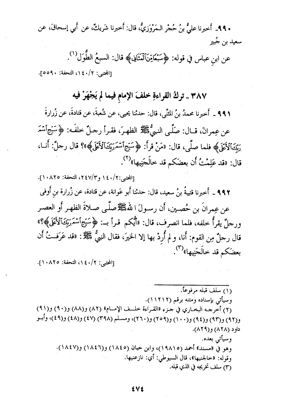 991 - أَخْبَرَنَا مُحَمَّدُ بْنُ الْمُثَنَّى، قَالَ: حَدَّثَنَا يَحْيَى، عَنْ شُعْبَةَ، عَنْ قَتَادَةَ، عَنْ زُرَارَةَ، عَنْ عِمْرَانَ، قَالَ: " صَلَّى النَّبِيُّ صَلَّى اللهُ عَلَيْهِ وَسَلَّمَ الظُّهْرَ فَقَرَأَ رَجُلٌ خَلْفَهُ {سَبِّحِ اسْمَ رَبِّكَ الْأَعْلَى} [الأعلى: 1] فَلَمَّا صَلَّى قَالَ: " §مَنْ قَرَأَ {سَبِّحِ اسْمَ رَبِّكَ الْأَعْلَى} [الأعلى: 1] قَالَ رَجُلٌ: أَنَا، قَالَ: «قَدْ عَلِمْتُ أَنَّ بَعْضَكُمْ قَدْ خَالَجَنِيهَا»