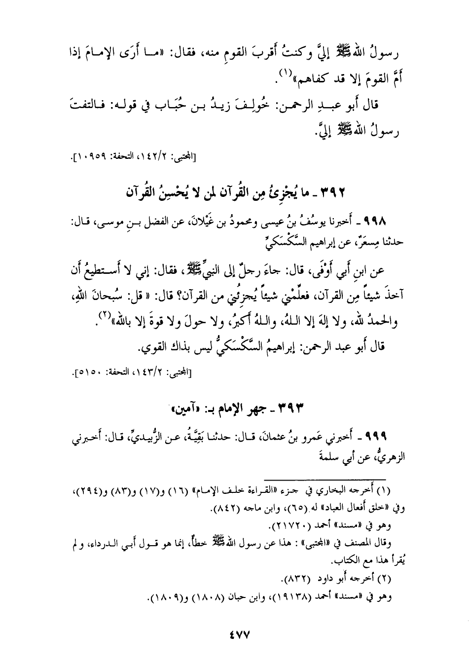 998 - أَخْبَرَنَا يُوسُفُ بْنُ عِيسَى، وَمَحْمُودُ بْنُ غَيْلَانَ، عَنِ الْفَضْلِ بْنِ مُوسَى، قَالَ: حَدَّثَنَا مِسْعَرُ، عَنْ إِبْرَاهِيمَ السَّكْسَكِيِّ، عَنِ ابْنِ أَبِي أَوْفَى، قَالَ: جَاءَ رَجُلٌ إِلَى النَّبِيِّ صَلَّى اللهُ عَلَيْهِ وَسَلَّمَ، فَقَالَ: إِنِّي لَا أَسْتَطِيعُ أَنْ آخُذَ شَيْئًا مِنَ الْقُرْآنِ، فَعَلِّمْنِي شَيْئًا يُجْزِئُنِي مِنَ الْقُرْآنِ، قَالَ: «§قُلْ سُبْحَانَ اللهِ، وَالْحَمْدُ لِلَّهِ، وَلَا إِلَهَ إِلَّا اللهُ، وَاللهُ أَكْبَرُ، وَلَا حَوْلَ وَلَا قُوَّةَ إِلَّا بِاللهِ» قَالَ أَبُو عَبْدِ الرَّحْمَنِ: إِبْرَاهِيمُ السَّكْسَكِيُّ لَيْسَ بِذَاكَ الْقَوِيَّ