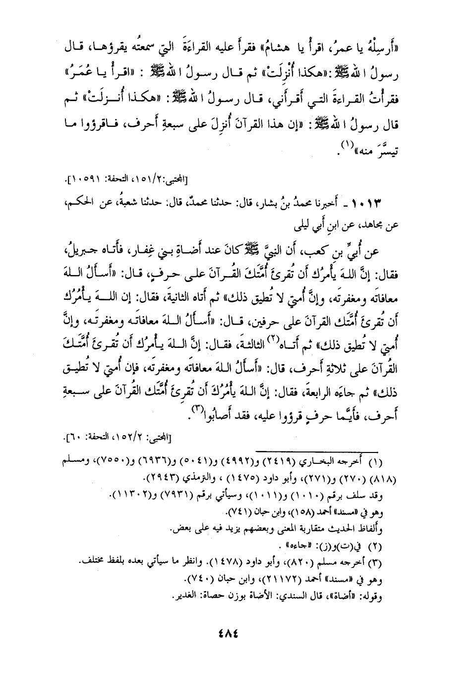 1013 - أَخْبَرَنَا مُحَمَّدُ بْنُ بَشَّارٍ، قَالَ: حَدَّثَنَا مُحَمَّدٌ، قَالَ: حَدَّثَنَا شُعْبَةُ، عَنِ الْحَكَمِ، عَنْ مُجَاهِدٍ، عَنِ ابْنِ أَبِي لَيْلَى، عَنْ أُبَيِّ بْنِ كَعْبٍ، أَنَّ النَّبِيَّ صَلَّى اللهُ عَلَيْهِ وَسَلَّمَ كَانَ عِنْدَ أَضَاةِ بَنِي غِفَارٍ، فَأَتَاهُ جِبْرِيلُ، فَقَالَ: إِنَّ اللهَ يَأْمُرُكَ أَنْ تُقْرِئَ أُمَّتَكَ الْقُرْآنَ عَلَى حَرْفٍ، قَالَ: «أَسْأَلُ اللهَ مُعَافَاتَهُ، وَمَغْفِرَتَهُ، وَإِنَّ أُمَّتِي لَا تُطِيقُ ذَلِكَ»، ثُمَّ أَتَاهُ الثَّانِيَةَ، فَقَالَ: إِنَّ اللهَ يَأْمُرُكَ أَنْ تُقْرِئَ أُمَّتَكَ الْقُرْآنَ عَلَى حَرْفَيْنِ، قَالَ: «أَسْأَلُ اللهَ مُعَافَاتَهُ، وَمَغْفِرَتَهُ، وَإِنَّ أُمَّتِي لَا تُطِيقُ ذَلِكَ»، ثُمَّ أَتَاهُ الثَّالِثَةَ، فَقَالَ: إِنَّ اللهَ يَأْمُرُكَ أَنْ تُقْرِئَ أُمَّتَكَ الْقُرْآنَ عَلَى ثَلَاثَةِ أَحْرُفٍ، قَالَ: «أَسْأَلُ اللهَ مُعَافَاتَهُ وَمَغْفِرَتَهُ، فَإِنَّ أُمَّتِي لَا تُطِيقُ ذَلِكَ»، ثُمَّ جَاءَهُ الرَّابِعَةَ، فَقَالَ: إِنَّ «§اللهَ يَأْمُرُكَ أَنْ تُقْرِئَ أُمَّتَكَ الْقُرْآنَ عَلَى سَبْعَةِ أَحْرُفٍ، فَأَيُّمَا حَرْفٍ قَرَءُوا عَلَيْهِ فَقَدْ أَصَابُوا» قَالَ أَبُو عَبْدِ الرَّحْمَنِ: مَنْصُورٌ خَالَفَ الْحَكَمَ فِي هَذَا الْحَدِيثِ رَوَاهُ عَنْ مُجَاهِدٍ، عَنْ عُبَيْدِ بْنِ عُمَيْرٍ مُرْسَلًا