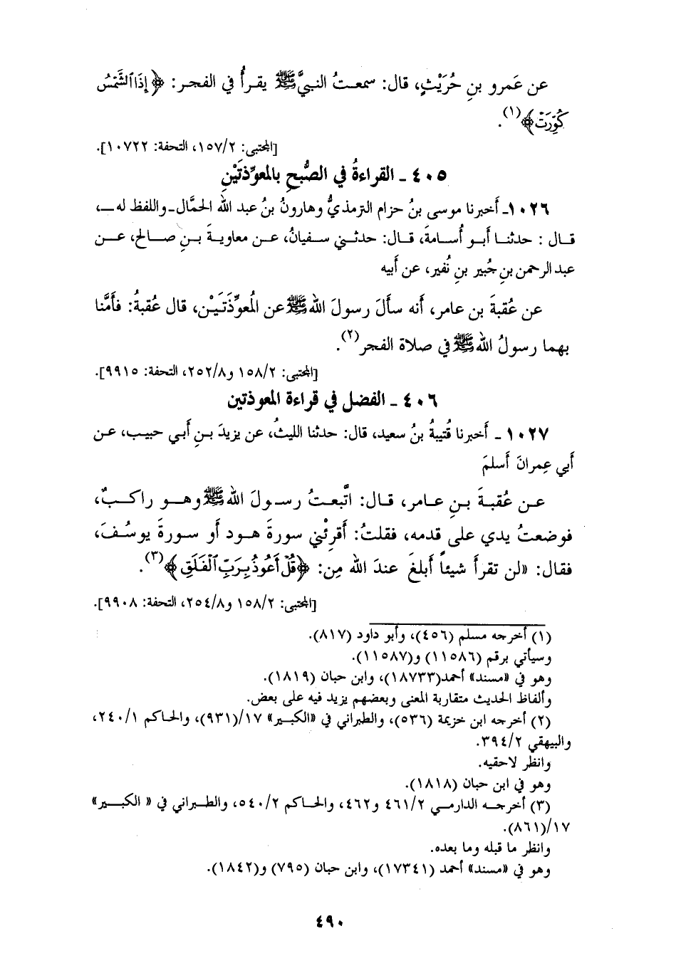 1026 - أَخْبَرَنَا مُوسَى بْنُ حِزَامٍ التِّرْمِذِيِّ، وَهَارُونُ بْنُ عَبْدِ اللهِ الْحَمَّالِ وَاللَّفْظُ لَهُ، قَالَ: حَدَّثَنَا أَبُو أُسَامَةَ، قَالَ: حَدَّثَنِي سُفْيَانُ، عَنْ مُعَاوِيَةَ بْنِ صَالِحٍ، عَنْ عَبْدِ الرَّحْمَنِ بْنِ جُبَيْرِ بْنِ نُفَيْرٍ، عَنْ أَبِيهِ، عَنْ عُقْبَةَ بْنِ عَامِرٍ، أَنَّهُ سَأَلَ رَسُولَ اللهِ صَلَّى اللهُ عَلَيْهِ وَسَلَّمَ عَنِ الْمُعَوِّذَتَيْنِ، قَالَ عُقْبَةُ: «§فَأَمَّنَا بِهِمَا رَسُولُ اللهِ صَلَّى اللهُ عَلَيْهِ وَسَلَّمَ فِي صَلَاةِ الْفَجْرِ»