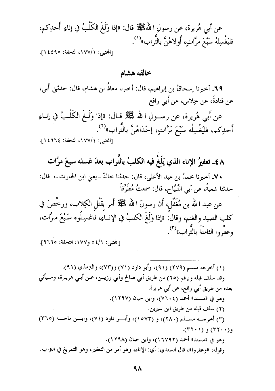 69 - أَخْبَرَنَا إِسْحَاقُ بْنُ إِبْرَاهِيمَ، قَالَ: أَخْبَرَنَا مُعَاذُ بْنُ هِشَامَ، قَالَ: حَدَّثَنِي أَبِي، عَنْ قَتَادَةَ، عَنْ خِلَاسٍ، عَنْ أَبِي رَافِعٍ، عَنْ أَبِي هُرَيْرَةَ، عَنْ رَسُولِ اللهِ صَلَّى اللهُ عَلَيْهِ وَسَلَّمَ قَالَ: «§إِذَا وَلَغَ الْكَلْبُ فِي إِنَاءِ أَحَدِكُمْ فَلْيَغْسِلْهُ سَبْعَ مَرَّاتٍ إِحْدَاهُنَّ بِالتُّرَابِ»