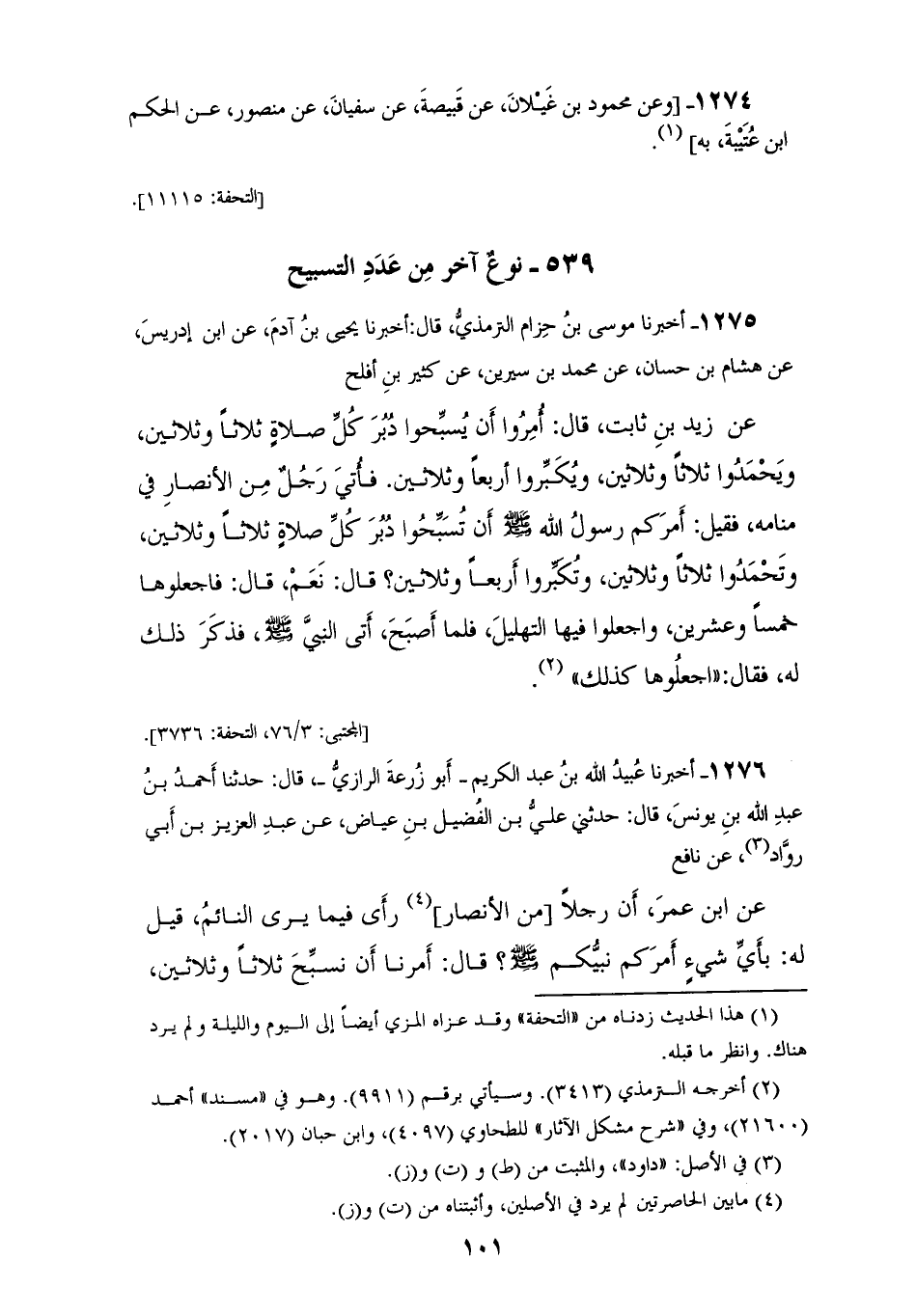 1275 - أَخْبَرَنَا مُوسَى بْنُ حِزَامٍ التِّرْمِذِيِّ، قَالَ: أَخْبَرَنَا يَحْيَى بْنُ آدَمَ، عَنِ ابْنِ إِدْرِيسَ، عَنْ هِشَامِ بْنِ حَسَّانَ، عَنْ مُحَمَّدِ بْنِ سِيرِينَ، عَنْ كَثِيرِ بْنِ أَفْلَحَ، عَنْ زَيْدِ بْنِ ثَابِتٍ، قَالَ: أُمِرُوا أَنْ يُسَبِّحُوا دُبُرَ كُلَّ صَلَاةٍ ثَلَاثًا وَثَلَاثِينَ، وَيَحْمَدُوا ثَلَاثًا وَثَلَاثِينَ، وَيُكَبِّرُوا أَرْبَعًا وَثَلَاثِينَ. فَأُتِيَ رَجُلٌ مِنَ الْأَنْصَارِ فِي مَنَامِهِ فَقِيلَ: " §أَمَرَكُمْ رَسُولُ اللهِ صَلَّى اللهُ عَلَيْهِ وَسَلَّمَ أَنْ تُسَبِّحُوا دُبُرَ كُلِّ صَلَاةٍ ثَلَاثًا وَثَلَاثِينَ، وَتَحْمَدُوا ثَلَاثًا وَثَلَاثِينَ، وَتُكَبِّرُوا أَرْبَعًا وَثَلَاثِينَ؟، قَالَ: نَعَمْ، قَالَ: فَاجْعَلُوهَا خَمْسًا وَعِشْرِينَ، وَاجْعَلُوا فِيهَا التَّهْلِيلَ، فَلَمَّا أَصْبَحَ أَتَى النَّبِيَّ صَلَّى اللهُ عَلَيْهِ وَسَلَّمَ فَذَكَرَ ذَلِكَ لَهُ، فَقَالَ: «اجْعَلُوهَا كَذَلِكَ»