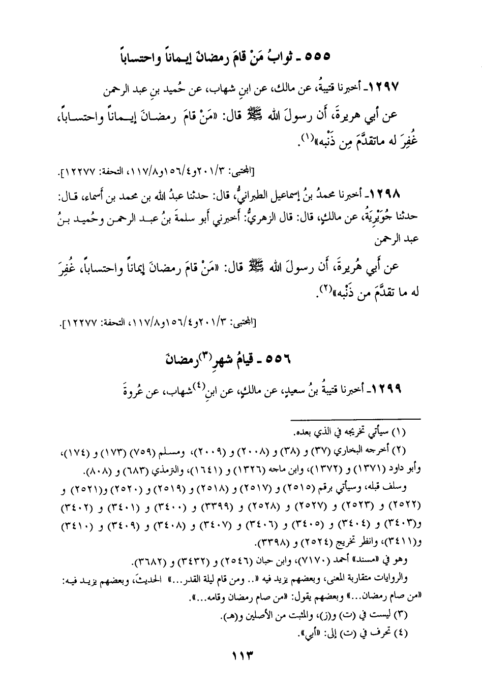 1297 - أَخْبَرَنَا قُتَيْبَةُ، عَنْ مَالِكٍ، عَنِ ابْنِ شِهَابٍ، عَنْ حُمَيْدِ بْنِ عَبْدِ الرَّحْمَنِ، عَنْ أَبِي هُرَيْرَةَ، أَنَّ رَسُولَ اللهِ صَلَّى اللهُ عَلَيْهِ وَسَلَّمَ قَالَ: «§مَنْ قَامَ رَمَضَانَ إِيمَانًا وَاحْتِسَابًا غُفِرَ لَهُ مَا تَقَدَّمَ مِنْ ذَنْبِهِ»