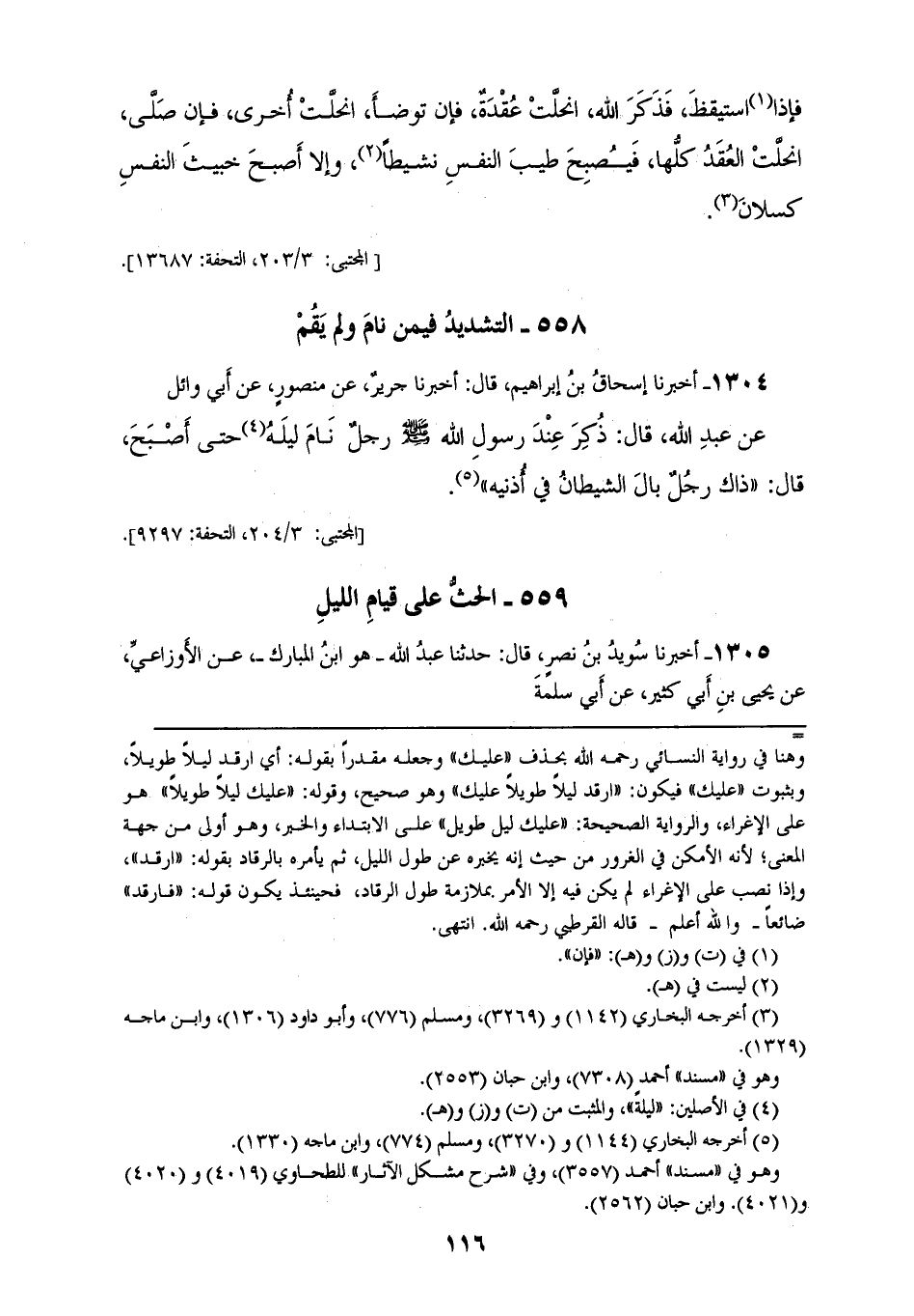 1304 - أَخْبَرَنَا إِسْحَاقُ بْنُ إِبْرَاهِيمَ، قَالَ: أَخْبَرَنَا جَرِيرٌ، عَنْ مَنْصُورٍ، عَنْ أَبِي وَائِلٍ، عَنْ عَبْدِ اللهِ، قَالَ: ذُكِرَ عِنْدَ رَسُولِ اللهِ صَلَّى اللهُ عَلَيْهِ وَسَلَّمَ رَجُلٌ نَامَ لَيْلَهُ حَتَّى أَصْبَحَ، قَالَ: «§ذَاكَ رَجُلٌ بَالَ الشَّيْطَانُ فِي أُذُنَيْهِ»