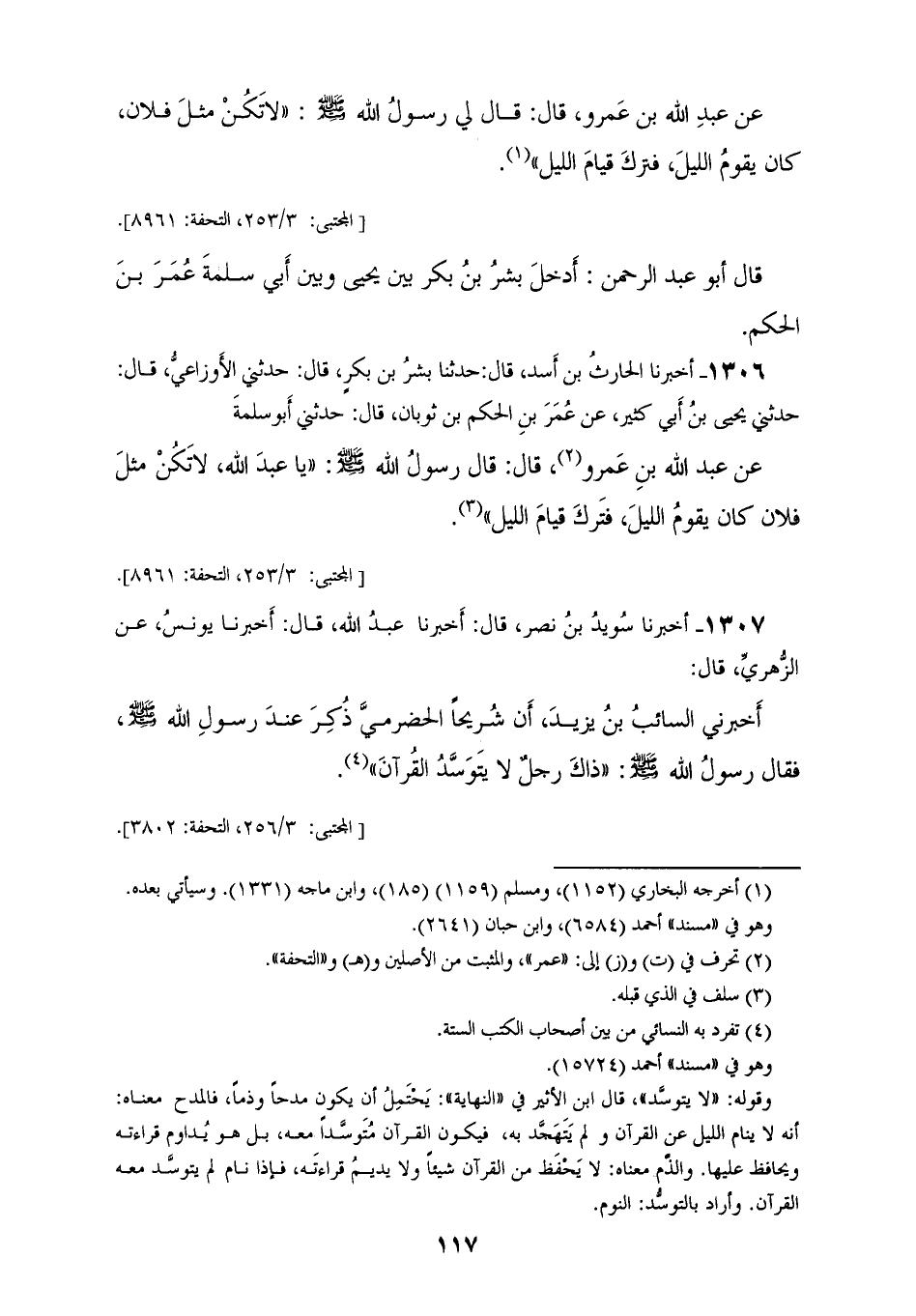 1305 - أَخْبَرَنَا سُوَيْدُ بْنُ نَصْرٍ، قَالَ: حَدَّثَنَا عَبْدُ اللهِ وَهُوَ ابْنُ الْمُبَارَكِ، عَنِ الْأَوْزَاعِيِّ، عَنْ يَحْيَى بْنِ أَبِي كَثِيرٍ، عَنْ أَبِي سَلَمَةَ، عَنْ عَبْدِ اللهِ بْنِ عَمْرٍو، قَالَ: قَالَ لِي رَسُولُ اللهِ صَلَّى اللهُ عَلَيْهِ وَسَلَّمَ: " §لَا تَكُنْ مِثْلَ فُلَانٍ: كَانَ يَقُومُ اللَّيْلَ فَتَرَكَ قِيَامَ اللَّيْلِ " قَالَ أَبُو عَبْدِ الرَّحْمَنِ: أَدْخَلَ بِشْرُ بْنُ بَكْرٍ بَيْنَ يَحْيَى وَبَيْنَ أَبِي سَلَمَةَ عُمَرَ بْنِ الْحَكَمِ