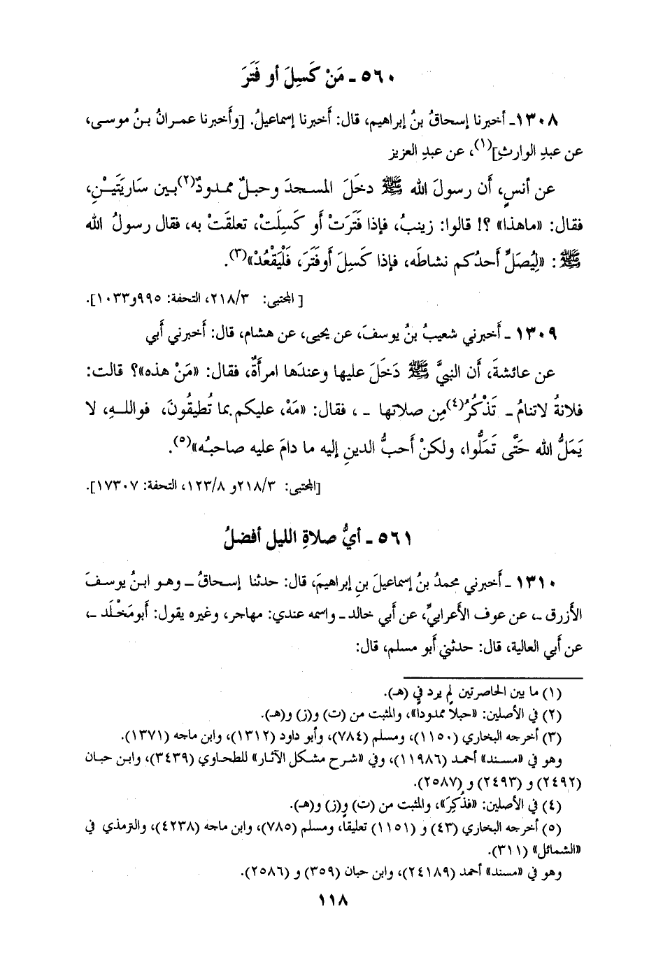 1308 - أَخْبَرَنَا إِسْحَاقُ بْنُ إِبْرَاهِيمَ، قَالَ: أَخْبَرَنَا إِسْمَاعِيلُ، وَأَخْبَرَنَا عِمْرَانُ بْنُ مُوسَى، عَنْ عَبْدِ الْوَارِثِ عَنْ عَبْدِ الْعَزِيزِ، عَنْ أَنَسٍ، أَنَّ رَسُولَ اللهِ صَلَّى اللهُ عَلَيْهِ وَسَلَّمَ دَخَلَ الْمَسْجِدَ وَحَبْلٌ مَمْدُودٌ بَيْنَ سَارِيَتَيْنِ، فَقَالَ: «مَا هَذَا»؟ قَالُوا: زَيْنَبَ، فَإِذَا فَتَرَتْ أَوْ كَسِلَتْ تَعَلَّقَتْ بِهِ. فَقَالَ رَسُولُ اللهِ صَلَّى اللهُ عَلَيْهِ وَسَلَّمَ: «§لِيَصِلِّ أَحَدُكُمْ نَشَاطَهُ، فَإِذَا كَسِلَ أَوْ فَتَرَ فَلْيَقْعُدْ»