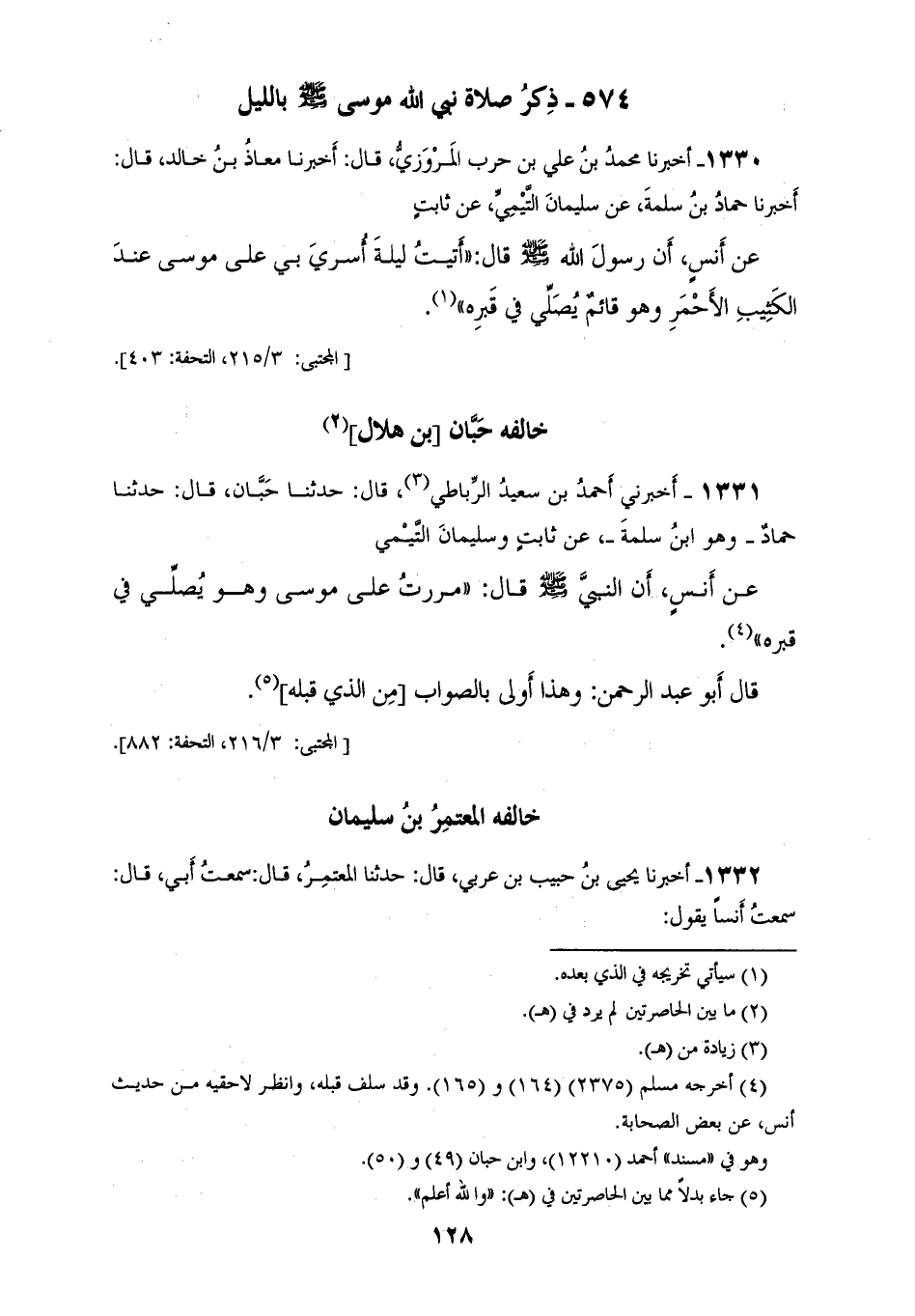 1330 - أَخْبَرَنَا مُحَمَّدُ بْنُ عَلِيِّ بْنِ حَرْبٍ الْمَرْوَزِيُّ، قَالَ: أَخْبَرَنَا مُعَاذُ بْنُ خَالِدٍ، قَالَ: أَخْبَرَنَا حَمَّادُ بْنُ سَلَمَةَ، عَنْ سُلَيْمَانَ التَّيْمِيِّ، عَنْ ثَابِتٍ، عَنْ أَنَسٍ، أَنَّ رَسُولَ اللهِ صَلَّى اللهُ عَلَيْهِ وَسَلَّمَ قَالَ: «§أَتَيْتُ لَيْلَةَ أُسْرِيَ بِي عَلَى مُوسَى عِنْدَ الْكَثِيبِ الْأَحْمَرِ، وَهُوَ قَائِمٌ يُصَلِّي فِي قَبْرِهِ» خَالَفَهُ حَبَّانُ بْنُ هِلَالٍ