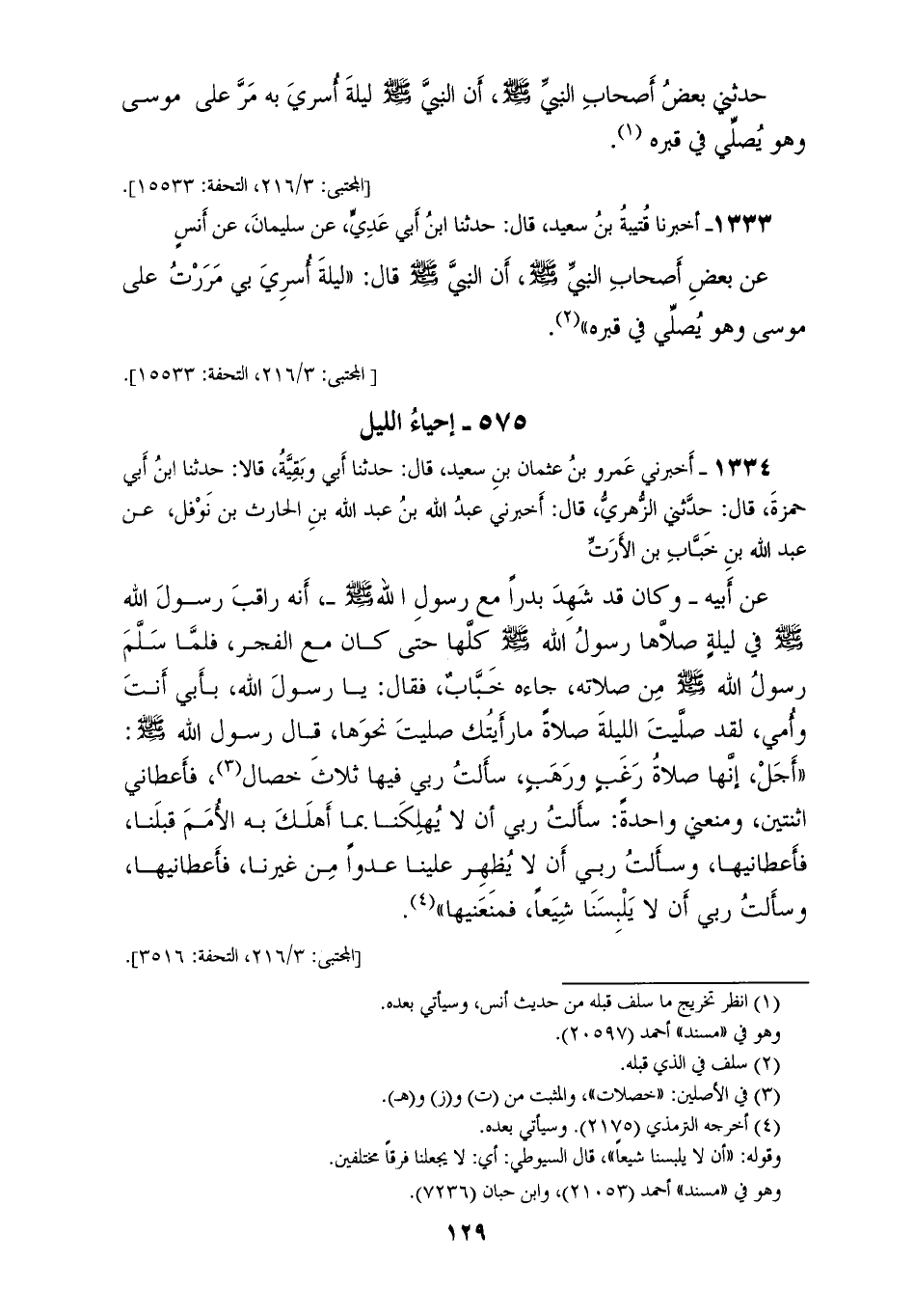 1334 - أَخْبَرَنِي عَمْرُو بْنُ عُثْمَانَ بْنِ سَعِيدٍ، قَالَ: حَدَّثَنَا أَبِي، وَبَقِيَّةُ، قَالَا: حَدَّثَنَا ابْنُ أَبِي حَمْزَةَ، قَالَ: حَدَّثَنِي الزُّهْرِيُّ، قَالَ: أَخْبَرَنِي عَبْدُ اللهِ بْنُ عَبْدِ اللهِ بْنِ الْحَارِثِ بْنِ نَوْفَلٍ، عَنْ عَبْدِ اللهِ بْنِ خَبَّابِ بْنِ الْأَرَتِّ، عَنْ أَبِيهِ، وَكَانَ قَدْ شَهِدَ بَدْرًا مَعَ رَسُولِ اللهِ صَلَّى اللهُ عَلَيْهِ وَسَلَّمَ: أَنَّهُ رَاقَبَ رَسُولَ اللهِ، صَلَّى اللهُ عَلَيْهِ وَسَلَّمَ، فِي لَيْلَةٍ صَلَّاهَا رَسُولُ اللهِ، صَلَّى اللهُ عَلَيْهِ وَسَلَّمَ، كُلَّهَا حَتَّى كَانَ مَعَ الْفَجْرِ، فَلَمَّا سَلَّمَ رَسُولُ اللهِ صَلَّى اللهُ عَلَيْهِ وَسَلَّمَ مِنْ صَلَاتِهِ جَاءَهُ خَبَّابٌ، فَقَالَ: يَا رَسُولَ اللهِ، بِأَبِي أَنْتَ وَأُمِّي، لَقَدْ صَلَّيْتَ اللَّيْلَةَ صَلَاةً مَا رَأَيْتُكَ صَلَّيْتَ نَحْوَهَا. قَالَ رَسُولُ اللهِ صَلَّى اللهُ عَلَيْهِ وَسَلَّمَ: " أَجَلْ إِنَّهَا صَلَاةُ رَغَبٍ وَرَهَبٍ، §سَأَلْتُ رَبِّي فِيهَا ثَلَاثَ خِصَالٍ، فَأَعْطَانِي اثْنَتَيْنِ، وَمَنَعَنِي وَاحِدَةً: سَأَلْتُ رَبِّي أَنْ لَا يُهْلِكَنَا بِمَا أَهْلَكَ بِهِ الْأُمَمَ قَبْلَنَا، فَأَعْطَانِيهَا، وَسَأَلْتُ رَبِّي أَنْ لَا يُظْهِرَ عَلَيْنَا عَدُوًّا مِنْ غَيْرِنَا، فَأَعْطَانِيهَا، وَسَأَلْتُ رَبِّي أَنْ لَا يَلْبِسَنَا شِيَعًا فَمَنَعَنِيهَا "