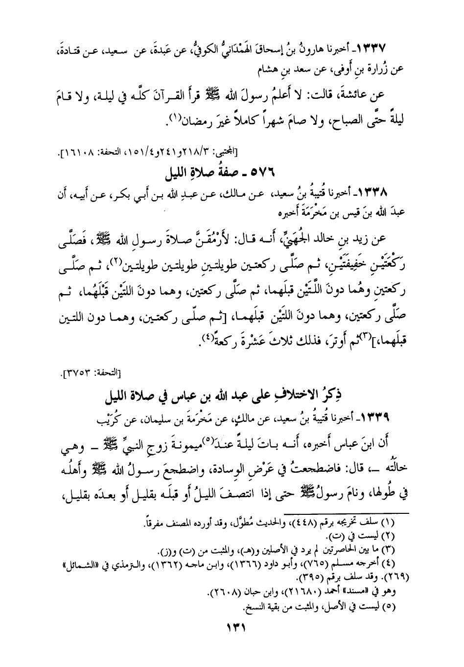 1337 - أَخْبَرَنَا هَارُونُ بْنُ إِسْحَاقَ الْهَمْدَانِيُّ الْكُوفِيُّ، عَنْ عَبْدَةَ، عَنْ سَعِيدٍ، عَنْ قَتَادَةَ، عَنْ زُرَارَةَ بْنِ أَوْفَى، عَنْ سَعْدِ بْنِ هِشَامٍ، عَنْ عَائِشَةَ قَالَتْ: لَا أَعْلَمُ رَسُولَ اللهِ صَلَّى اللهُ عَلَيْهِ وَسَلَّمَ «§قَرَأَ الْقُرْآنَ كُلَّهُ فِي لَيْلَةٍ، وَلَا قَامَ لَيْلَةً حَتَّى الصَّبَّاحِ، وَلَا صَامَ شَهْرًا كَامِلًا غَيْرَ رَمَضَانَ»