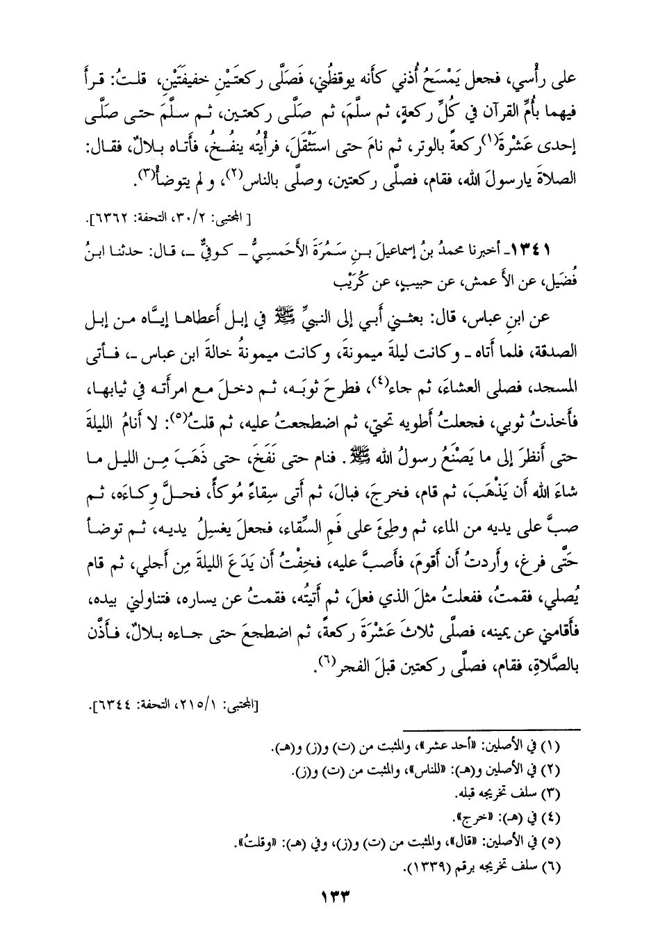 1341 - أَخْبَرَنَا مُحَمَّدُ بْنُ إِسْمَاعِيلَ بْنِ سَمُرَةَ الْأَحْمَسِيُّ، كُوفِيٌّ قَالَ: حَدَّثَنَا ابْنُ فُضَيْلٍ، عَنِ الْأَعْمَشِ، عَنْ حَبِيبٍ، عَنْ كُرَيْبٍ، عَنِ ابْنِ عَبَّاسٍ قَالَ: بَعَثَنِي أَبِي إِلَى النَّبِيِّ صَلَّى اللهُ عَلَيْهِ وَسَلَّمَ فِي إِبِلٍ أَعْطَاهَا إِيَّاهُ مِنْ إِبِلِ الصَّدَقَةِ، فَلَمَّا أَتَاهُ، وَكَانَتْ لَيْلَةُ مَيْمُونَةَ، وَكَانَتْ مَيْمُونَةُ خَالَةَ ابْنِ عَبَّاسٍ فَأَتَى الْمَسْجِدَ فَصَلَّى الْعِشَاءَ، ثُمَّ جَاءَ، فَطَرَحَ ثَوْبَهُ، ثُمَّ دَخَلَ مَعَ امْرَأَتِهِ فِي ثِيَابِهَا، فَأَخَذْتُ ثَوْبِي، فَجَعَلْتُ أَطْوِيهِ تَحْتِي، ثُمَّ اضْطَجَعْتُ عَلَيْهِ، ثُمَّ قُلْتُ: لَا أَنَامُ اللَّيْلَةَ حَتَّى أَنْظُرَ إِلَى مَا يَصْنَعُ رَسُولُ اللهِ صَلَّى اللهُ عَلَيْهِ وَسَلَّمَ، فَنَامَ حَتَّى نَفَخَ، حَتَّى ذَهَبَ مِنَ اللَّيْلِ مَا شَاءَ اللهُ أَنْ يَذْهَبَ ثُمَّ قَامَ، فَخَرَجَ، فَبَالَ، ثُمَّ أَتَى سِقَاءًا مُوكَئًا فَحَلَّ وِكَاءَهُ، ثُمَّ صَبَّ عَلَى يَدَيْهِ مِنَ الْمَاءِ، ثُمَّ وَطِئَ عَلَى فَمِ السِّقَاءِ فَجَعَلَ يَغْسِلُ يَدَيْهِ، ثُمَّ تَوَضَّأَ حَتَّى فَرَغَ، وَأَرَدْتُ أَنْ أَقُومَ فَأَصُبَّ عَلَيْهِ، فَخِفْتُ أَنْ يَدَعَ اللَّيْلَةَ مِنْ أَجْلِي، ثُمَّ قَامَ يُصَلِّي، فَقُمْتُ، فَفَعَلْتُ مِثْلَ الَّذِي فَعَلَ، ثُمَّ أَتَيْتُهُ، فَقُمْتُ عَنْ يَسَارِهِ، فَتَنَاوَلَنِي بِيَدِهِ فَأَقَامَنِي عَنْ يَمِينِهِ، «§فَصَلَّى ثَلَاثَ عَشْرَةَ رَكْعَةً، ثُمَّ اضْطَجَعَ حَتَّى جَاءَهُ بِلَالٌ فَأَذَّنَ بِالصَّلَاةِ، فَقَامَ فَصَلَّى رَكْعَتَيْنِ قَبْلَ الْفَجْرِ» خَالَفَهُ سَعِيدُ بْنُ جُبَيْرٍ