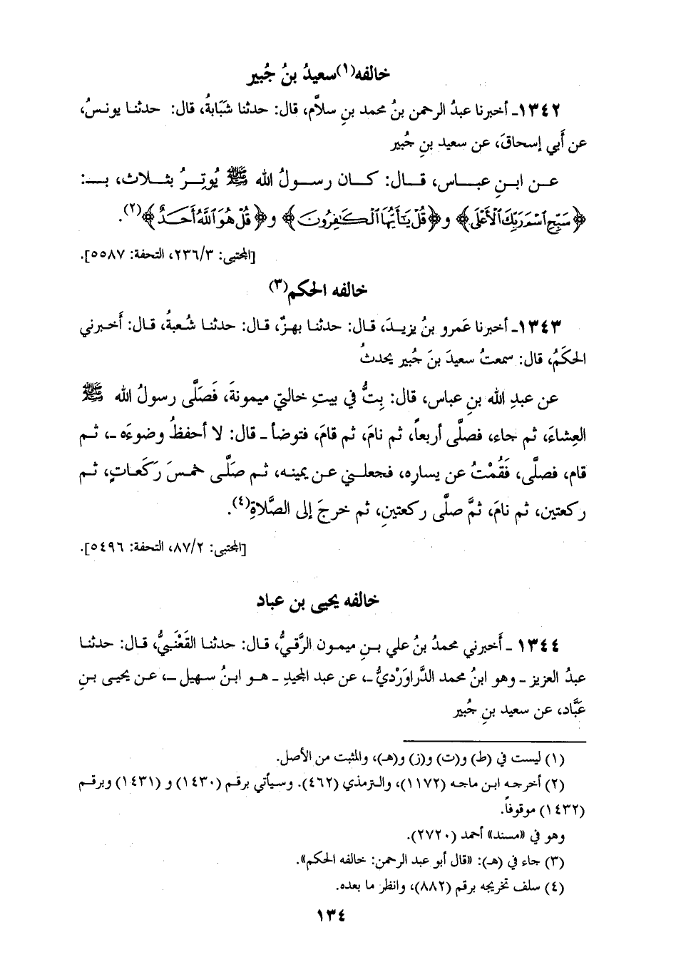 1342 - أَخْبَرَنَا عَبْدُ الرَّحْمَنِ بْنُ مُحَمَّدِ بْنِ سَلَامٍ، قَالَ: حَدَّثَنَا شَبَابَةُ، قَالَ: حَدَّثَنَا يُونُسُ، عَنْ أَبِي إِسْحَاقَ، عَنْ سَعِيدِ بْنِ جُبَيْرٍ، عَنِ ابْنِ عَبَّاسٍ، قَالَ: كَانَ رَسُولُ اللهِ صَلَّى اللهُ عَلَيْهِ وَسَلَّمَ " §يُوتِرُ بِثَلَاثٍ: بِسَبَّحِ اسْمَ رَبِّكَ الْأَعْلَى، وَقُلْ يَا أَيُّهَا الْكَافِرُونَ، وَقُلْ هُوَ اللهُ أَحَدٌ " خَالَفَهُ الْحَكَمُ