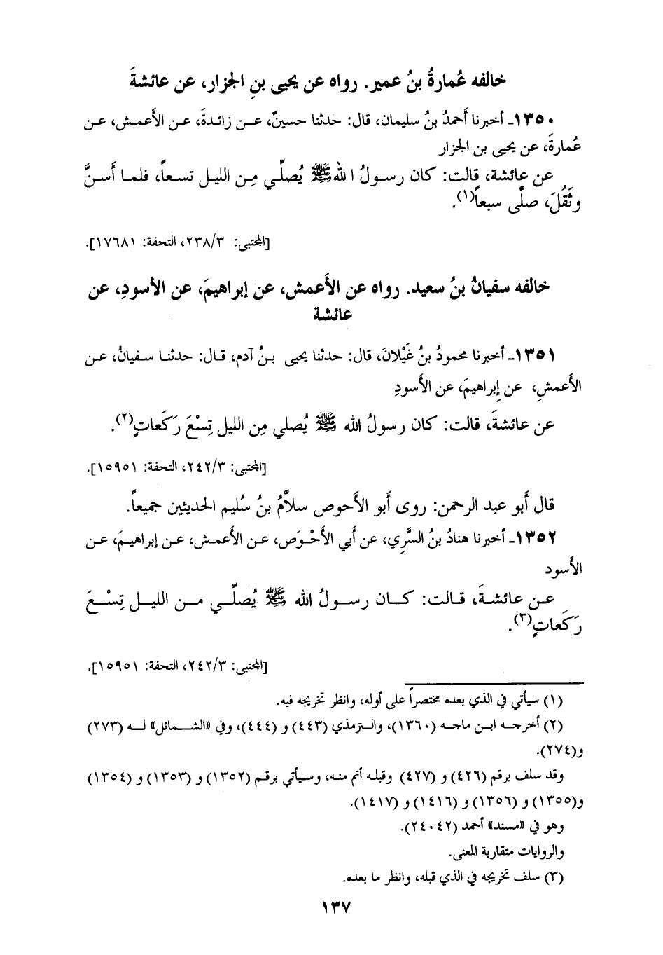 1350 - أَخْبَرَنَا أَحْمَدُ بْنُ سُلَيْمَانَ، قَالَ حَدَّثَنَا حُسَيْنٌ، عَنْ زَائِدَةَ، عَنِ الْأَعْمَشِ، عَنْ عُمَارَةَ، عَنْ يَحْيَى بْنِ الْجَزَّارِ، عَنْ عَائِشَةَ، قَالَتْ: كَانَ رَسُولُ اللهِ صَلَّى اللهُ عَلَيْهِ وَسَلَّمَ «§يُصَلِّي مِنَ اللَّيْلِ تِسْعًا، فَلَمَّا أَسَنَّ وَثَقُلَ صَلَّى سَبْعًا» خَالَفَهُ سُفْيَانُ بْنُ سَعِيدٍ رَوَاهُ عَنِ الْأَعْمَشِ عَنْ إِبْرَاهِيمَ عَنِ الْأَسْوَدِ عَنْ عَائِشَةَ