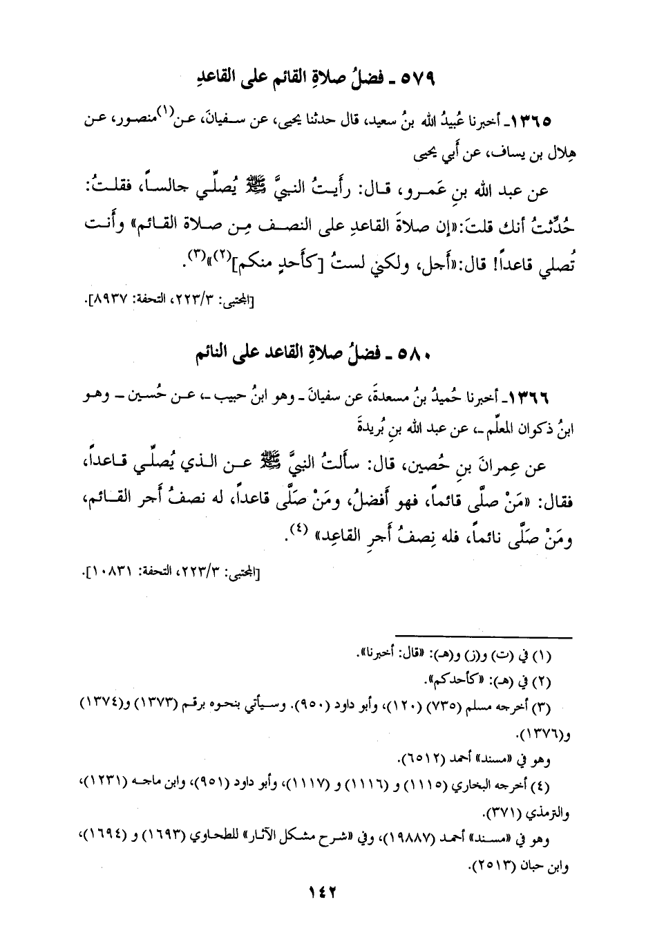 1366 - أَخْبَرَنَا حُمَيْدُ بْنُ مَسْعَدَةَ، عَنْ سُفْيَانَ وَهُوَ ابْنُ حَبِيبٍ، عَنْ حُسَيْنٍ وَهُوَ ابْنُ ذَكْوَانَ الْمُعَلِّمِ، عَنْ عَبْدِ اللهِ بْنِ بُرَيْدَةَ، عَنْ عِمْرَانَ بْنِ حُصَيْنٍ قَالَ: سَأَلْتُ النَّبِيَّ صَلَّى اللهُ عَلَيْهِ وَسَلَّمَ عَنِ الَّذِي يُصَلِّي قَاعِدًا، فَقَالَ: «§مَنْ صَلَّى قَائِمًا فَهُوَ أَفْضَلُ، وَمَنْ صَلَّى قَاعِدًا لَهُ نِصْفُ أَجْرِ الْقَائِمِ، وَمَنْ صَلَّى نَائِمًا فَلَهُ نِصْفُ أَجْرِ الْقَاعِدِ»