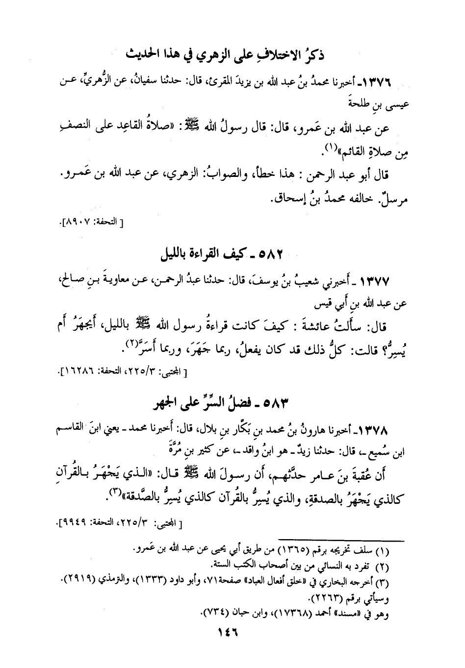 1376 - أَخْبَرَنَا مُحَمَّدُ بْنُ عَبْدِ اللهِ بْنِ يَزِيدَ الْمُقْرِئُ، قَالَ: حَدَّثَنَا سُفْيَانُ، عَنِ الزُّهْرِيِّ، عَنْ عِيسَى بْنِ طَلْحَةَ، عَنْ عَبْدِ اللهِ بْنِ عَمْرٍو قَالَ: قَالَ رَسُولُ اللهِ صَلَّى اللهُ عَلَيْهِ وَسَلَّمَ: «§صَلَاةُ الْقَاعِدِ عَلَى النِّصْفِ مِنْ صَلَاةِ الْقَائِمِ» قَالَ أَبُو عَبْدِ الرَّحْمَنِ: هَذَا خَطَأٌ، وَالصَّوَابُ: الزُّهْرِيُّ، عَنْ عَبْدِ اللهِ بْنِ عَمْرٍو مُرْسَلٌ، خَالَفَهُ مُحَمَّدُ بْنُ إِسْحَاقَ كَيْفَ الْقِرَاءَةُ بِاللَّيْلِ