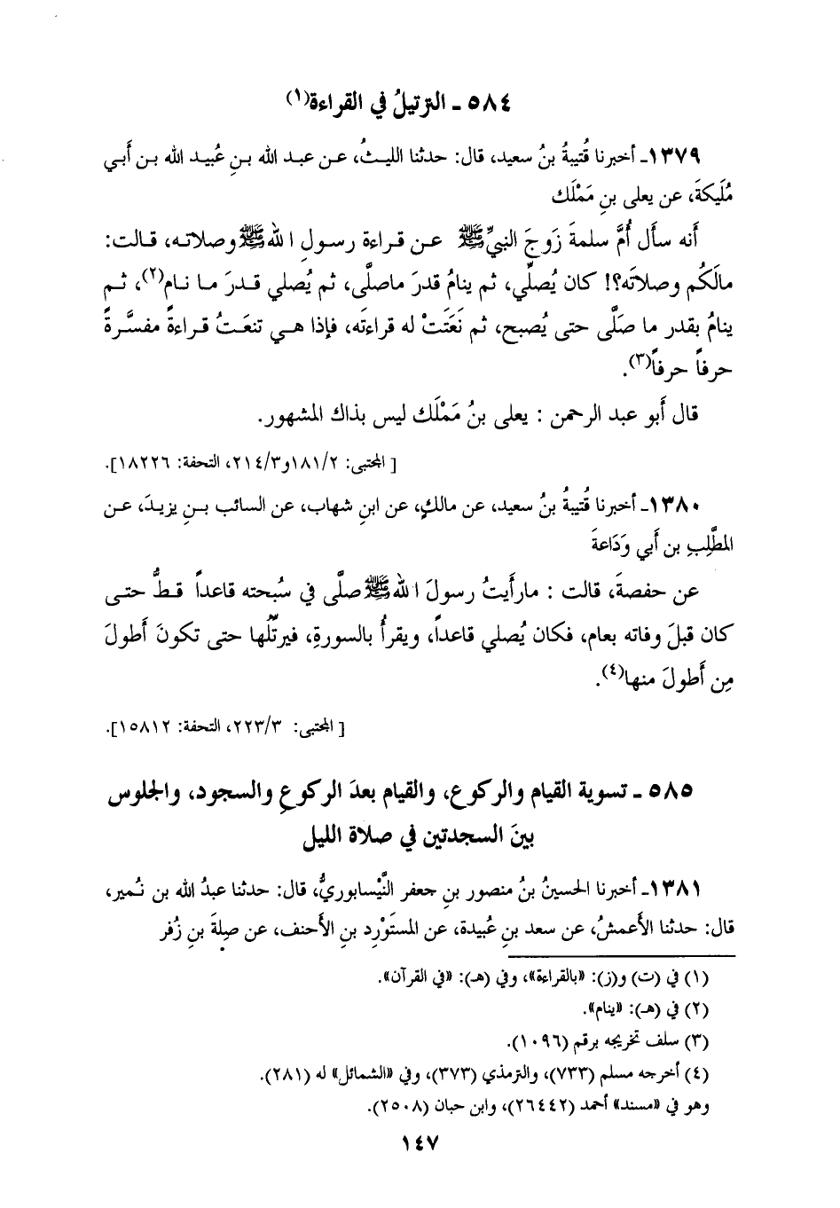 1379 - أَخْبَرَنَا قُتَيْبَةُ بْنُ سَعِيدٍ، قَالَ: حَدَّثَنَا اللَّيْثُ، عَنْ عَبْدِ اللهِ بْنِ عُبَيْدِ اللهِ بْنِ أَبِي مُلَيْكَةَ، عَنْ يَعْلَى بْنِ مَمْلَكٍ، أَنَّهُ سَأَلَ أُمَّ سَلَمَةَ زَوْجَ النَّبِيِّ صَلَّى اللهُ عَلَيْهِ وَسَلَّمَ عَنْ قِرَاءَةِ رَسُولِ اللهِ صَلَّى اللهُ عَلَيْهِ وَسَلَّمَ وَصَلَاتِهِ، قَالَتْ: «§مَا لَكُمْ وَصَلَاتِهِ، كَانَ يُصَلِّي، ثُمَّ يَنَامُ قَدْرَ مَا صَلَّى، ثُمَّ يُصَلِّي قَدْرَ مَا نَامَ، ثُمَّ يَنَامُ بِقَدْرِ مَا صَلَّى حَتَّى يُصْبِحَ، ثُمَّ نَعَتَتْ لَهُ قِرَاءَتَهُ، فَإِذَا هِيَ تَنْعَتُ قِرَاءَةً مُفَسَّرَةً حَرْفًا حَرْفًا». قَالَ أَبُو عَبْدِ الرَّحْمَنِ: يَعْلَى بْنُ مَمْلَكٍ لَيْسَ بِذَاكَ الْمَشْهُورِ