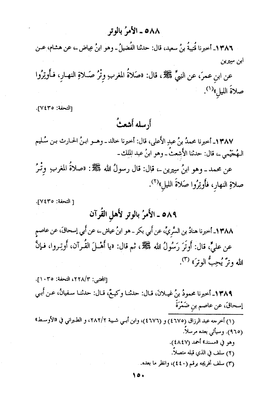 1386 - أَخْبَرَنَا قُتَيْبَةُ بْنُ سَعِيدٍ، قَالَ: حَدَّثَنَا الْفُضَيْلُ وَهُوَ ابْنُ عِيَاضٍ، عَنْ هِشَامٍ، عَنِ ابْنِ سِيرِينَ، عَنِ ابْنِ عُمَرَ، عَنِ النَّبِيِّ صَلَّى اللهُ عَلَيْهِ وَسَلَّمَ قَالَ: «§صَلَاةُ الْمَغْرِبِ وِتْرُ صَلَاةِ النَّهَارِ، فَأَوْتِرُوا صَلَاةَ اللَّيْلِ» أَرْسَلَهُ أَشْعَثُ