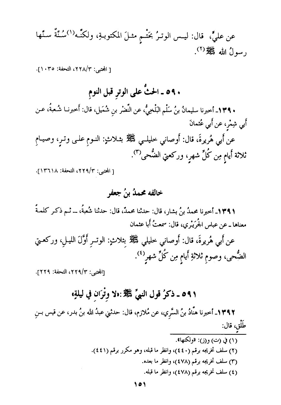1390 - أَخْبَرَنَا سُلَيْمَانُ بْنُ سَلْمٍ الْبَلْخِيُّ، عَنِ النَّضْرِ بْنِ شُمَيْلٍ، قَالَ: أَخْبَرَنَا شُعْبَةُ، عَنْ أَبِي شِمْرٍ، عَنْ أَبِي عُثْمَانَ، عَنْ أَبِي هُرَيْرَةَ، قَالَ: أَوْصَانِي خَلِيلِي صَلَّى اللهُ عَلَيْهِ وَسَلَّمَ بِثَلَاثٍ: «§النَّوْمِ عَلَى وِتْرٍ، وَصِيَامِ ثَلَاثَةِ أَيَّامٍ مِنْ كُلِّ شَهْرٍ، وَرَكْعَتَيِ الضُّحَى» خَالَفَهُ مُحَمَّدُ بْنُ جَعْفَرٍ