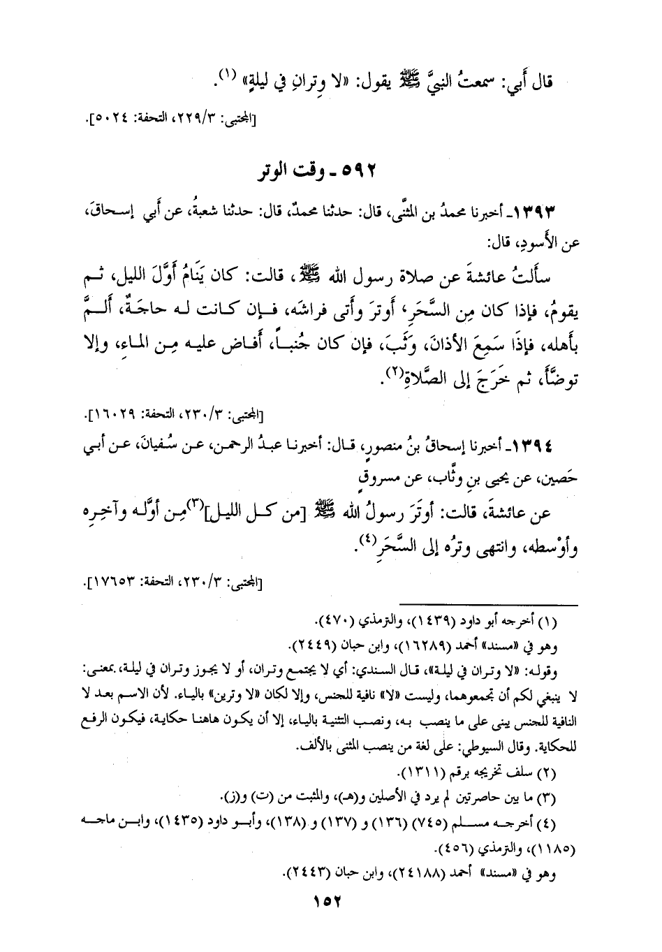 1394 - أَخْبَرَنَا إِسْحَاقُ بْنُ مَنْصُورٍ، قَالَ أَخْبَرَنَا عَبْدُ الرَّحْمَنِ، عَنْ سُفْيَانَ، عَنْ أَبِي حَصِينٍ، عَنْ يَحْيَى بْنِ وَثَّابٍ، عَنْ مَسْرُوقٍ، عَنْ عَائِشَةَ، قَالَتْ: «§أَوْتَرَ رَسُولُ اللهِ صَلَّى اللهُ عَلَيْهِ وَسَلَّمَ مِنْ كُلِّ اللَّيْلِ، مِنْ أَوَّلِهِ وَآخِرِهِ وَأَوْسَطِهِ، وَانْتَهَى وِتْرُهُ إِلَى السَّحَرِ»