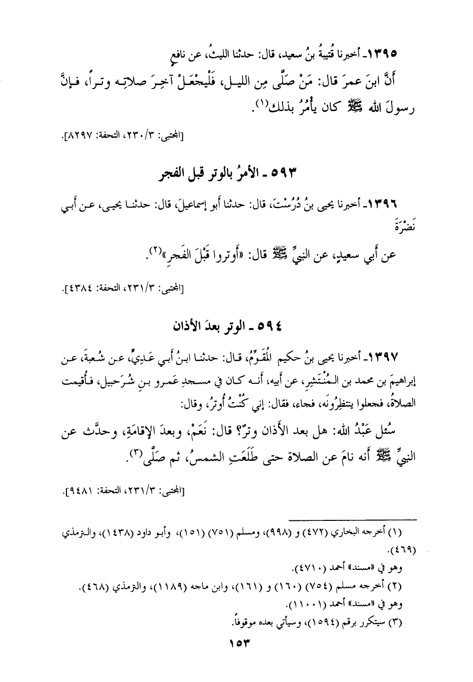 1396 - أَخْبَرَنَا يَحْيَى بْنُ دُرُسْتَ، قَالَ: حَدَّثَنَا أَبُو إِسْمَاعِيلَ، قَالَ: حَدَّثَنَا يَحْيَى، عَنْ أَبِي نَضْرَةَ، عَنْ أَبِي سَعِيدٍ، عَنِ النَّبِيِّ صَلَّى اللهُ عَلَيْهِ وَسَلَّمَ قَالَ: «§أَوْتِرُوا قَبْلَ الْفَجْرِ»