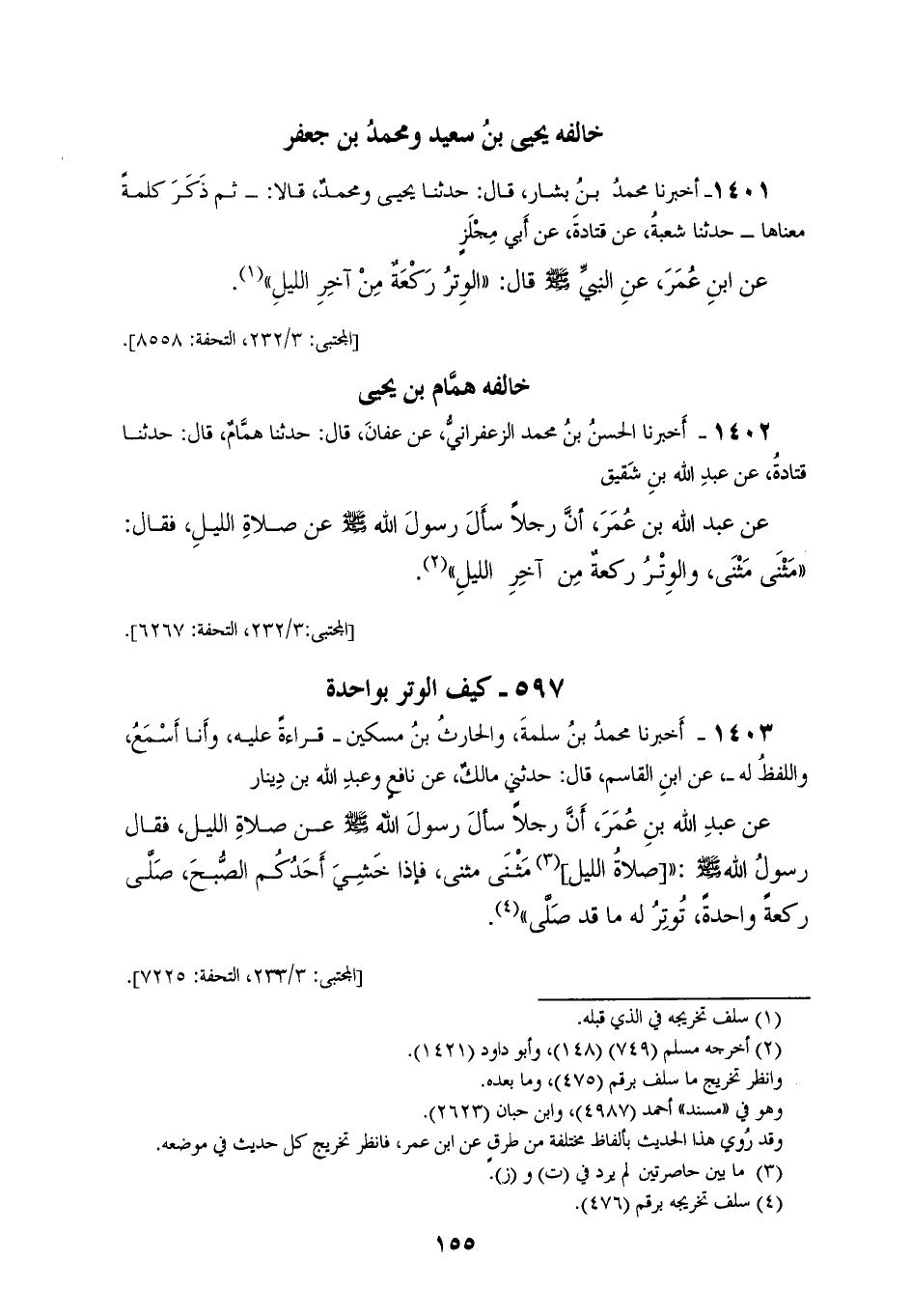 1402 - أَخْبَرَنَا الْحَسَنُ بْنُ مُحَمَّدٍ الزَّعْفَرَانِيُّ، عَنْ عَفَّانَ، قَالَ: حَدَّثَنَا هَمَّامٌ، قَالَ: حَدَّثَنَا قَتَادَةُ، عَنْ عَبْدِ اللهِ بْنِ شَقِيقٍ، عَنْ عَبْدِ اللهِ بْنِ عُمَرَ، أَنَّ رَجُلًا سَأَلَ رَسُولَ اللهِ صَلَّى اللهُ عَلَيْهِ وَسَلَّمَ عَنْ صَلَاةِ اللَّيْلِ فَقَالَ: «§مَثْنَى مَثْنَى، وَالْوَتْرُ رَكْعَةٌ مِنْ آخِرِ اللَّيْلِ»