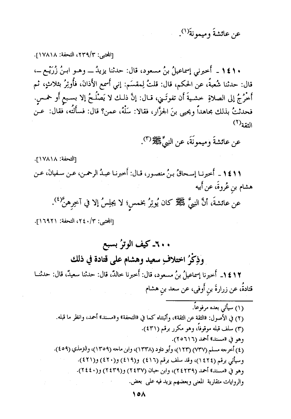 1411 - أَخْبَرَنَا إِسْحَاقُ بْنُ مَنْصُورٍ، قَالَ: أَخْبَرَنَا عَبْدُ الرَّحْمَنِ، عَنْ سُفْيَانَ، عَنْ هِشَامِ بْنِ عُرْوَةَ، عَنْ أَبِيهِ، عَنْ عَائِشَةَ،: أَنَّ النَّبِيَّ صَلَّى اللهُ عَلَيْهِ وَسَلَّمَ كَانَ «§يُوتِرُ بِخَمْسٍ لَا يَجْلِسُ إِلَّا فِي آخِرِهِنَّ»