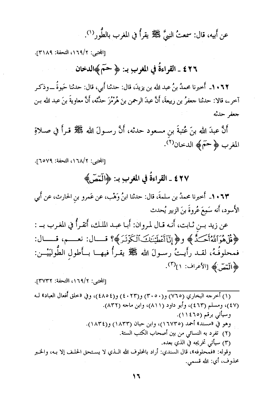 1063 - أَخْبَرَنَا مُحَمَّدُ بْنُ سَلَمَةَ، قَالَ: حَدَّثَنَا ابْنُ وَهْبٍ، عَنْ عَمْرِو بْنِ الْحَارِثِ، عَنْ أَبِي الْأَسْوَدِ، أَنَّهُ سَمِعَ عُرْوَةَ بْنَ الزُّبَيْرِ، يُحَدِّثُ، عَنْ زَيْدِ بْنِ ثَابِتٍ أَنَّهُ قَالَ لِمَرْوَانَ: أَبَا عَبْدِ الْمَلِكِ، أَتَقْرَأُ فِي الْمَغْرِبِ بِقُلْ هُوَ اللهُ أَحَدٌ، وَإِنَّا أَعْطَيْنَاكَ الْكَوْثَرُ؟ قَالَ: نَعَمْ، قَالَ: فَمَحْلُوفَهُ لَقَدْ رَأَيْتُ رَسُولَ اللهِ صَلَّى اللهُ عَلَيْهِ وَسَلَّمَ «§يَقْرَأُ فِيهَا بِأَطْوَلِ الطُّولَيَيْنِ المص»