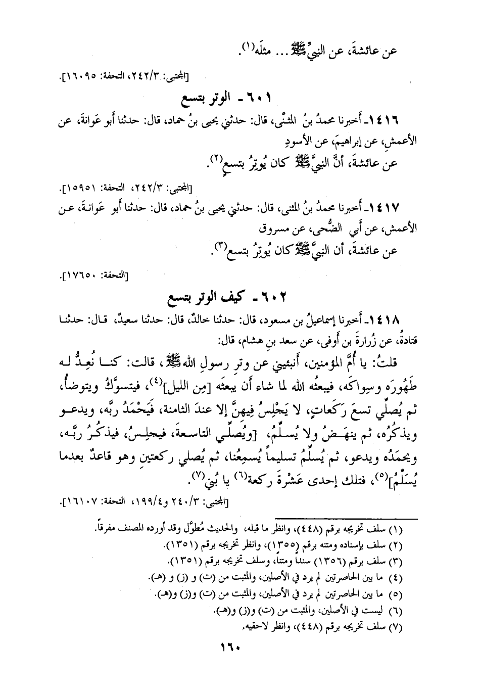 1416 - أَخْبَرَنَا مُحَمَّدُ بْنُ الْمُثَنَّى، قَالَ: حَدَّثَنِي يَحْيَى بْنُ حَمَّادٍ، قَالَ: حَدَّثَنَا أَبُو عَوَانَةَ، عَنِ الْأَعْمَشِ، عَنْ إِبْرَاهِيمَ، عَنِ الْأَسْوَدِ، عَنْ عَائِشَةَ،: أَنَّ النَّبِيَّ صَلَّى اللهُ عَلَيْهِ وَسَلَّمَ كَانَ «§يُوتِرُ بِتِسْعٍ»