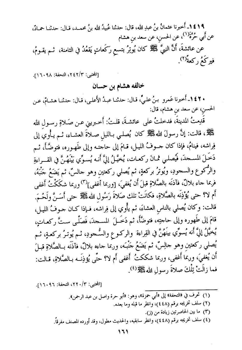 1419 - أَخْبَرَنَا عُثْمَانُ بْنُ عَبْدِ اللهِ، قَالَ: حَدَّثَنَا عُبَيْدُ اللهِ بْنِ مُحَمَّدٍ، قَالَ: حَدَّثَنَا حَمَّادٌ، عَنْ أَبِي حَرَّةَ، عَنِ الْحَسَنِ، عَنْ سَعْدِ بْنِ هِشَامٍ، عَنْ عَائِشَةَ،: أَنَّ النَّبِيَّ صَلَّى اللهُ عَلَيْهِ وَسَلَّمَ كَانَ «§يُوتِرُ بِتِسْعِ رَكَعَاتٍ يَقْعُدُ فِي الثَّامِنَةِ، ثُمَّ يَقُومُ فَيَرْكَعُ رَكْعَةً» خَالَفَهُ هِشَامُ بْنُ حَسَّانٍ
