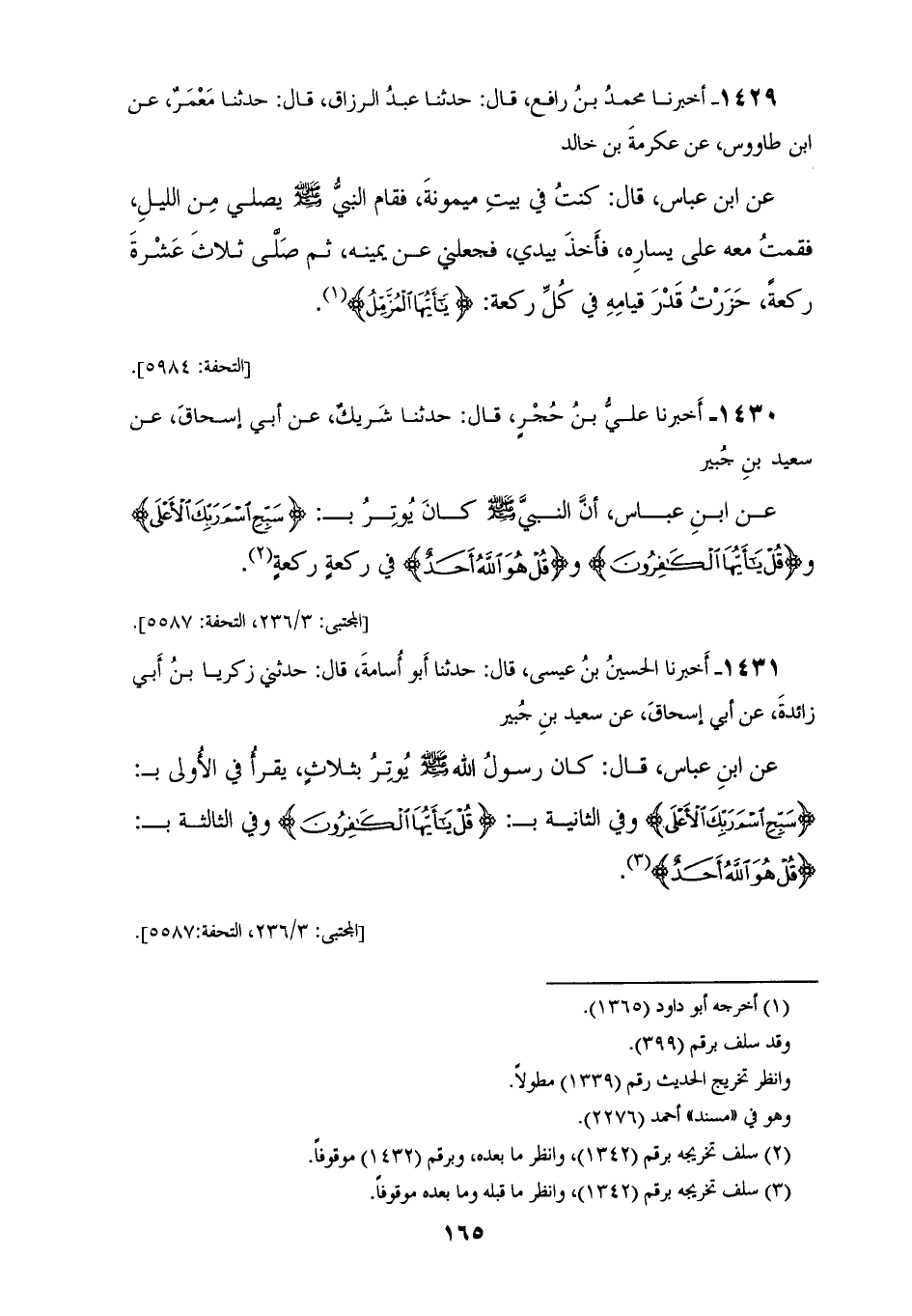 1430 - أَخْبَرَنَا عَلِيُّ بْنُ حُجْرٍ، قَالَ: حَدَّثَنَا شَرِيكٌ، عَنْ أَبِي إِسْحَاقَ، عَنْ سَعِيدِ بْنِ جُبَيْرٍ، عَنِ ابْنِ عَبَّاسٍ،: أَنَّ النَّبِيَّ صَلَّى اللهُ عَلَيْهِ وَسَلَّمَ كَانَ «§يُوتِرُ بِسَبَّحِ اسْمَ رَبِّكَ الْأَعْلَى، وَقُلْ يَا أَيُّهَا الْكَافِرُونَ، وَقُلْ هُوَ اللهُ أَحَدٌ فِي رَكْعَةٍ رَكْعَةٍ»