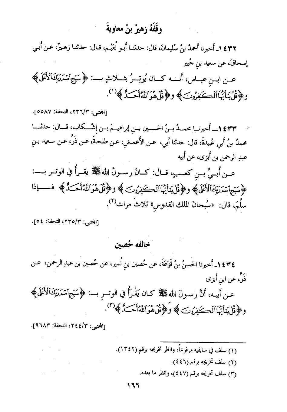 1432 - أَخْبَرَنَا أَحْمَدُ بْنُ سُلَيْمَانَ، قَالَ: حَدَّثَنَا أَبُو نُعَيْمٍ، قَالَ: حَدَّثَنَا زُهَيْرٌ، عَنْ أَبِي إِسْحَاقَ، عَنْ سَعِيدِ بْنِ جُبَيْرٍ، عَنِ ابْنِ عَبَّاسٍ، أَنَّهُ كَانَ " §يُوتِرُ بِثَلَاثٍ: بِسَبَّحِ اسْمَ رَبِّكَ الْأَعْلَى، وَقُلْ يَا أَيُّهَا الْكَافِرُونَ، وَقُلْ هُوَ اللهَ أَحَدٌ "