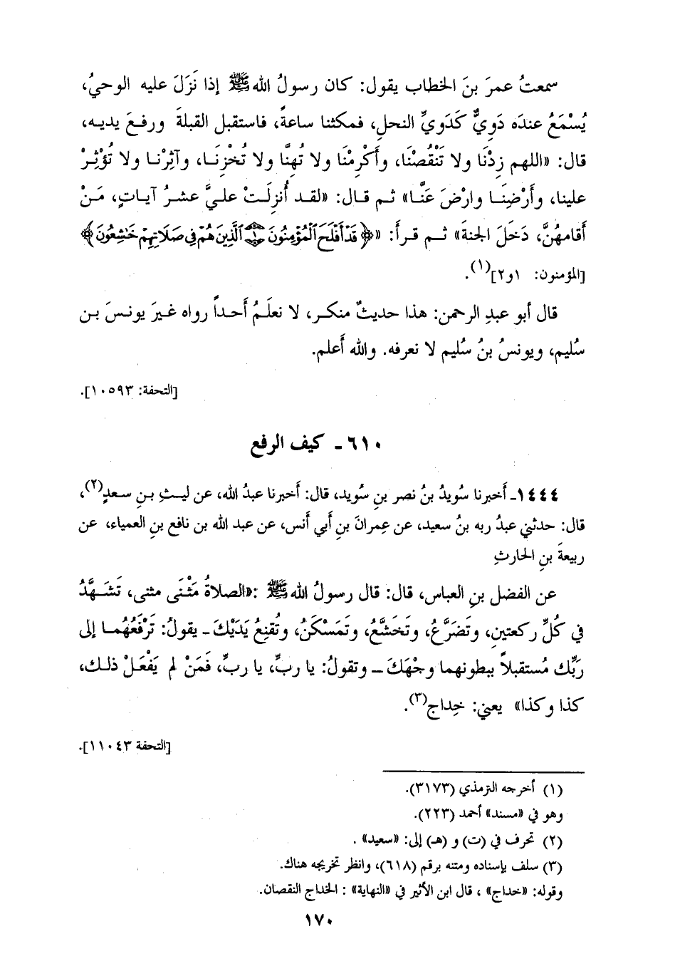 1443 - أَخْبَرَنَا إِسْحَاقُ بْنُ إِبْرَاهِيمَ، قَالَ: أَخْبَرَنَا عَبْدُ الرَّزَّاقِ، قَالَ: حَدَّثَنَا يُونُسُ بْنُ سُلَيْمٍ، قَالَ: أَمْلَى عَلَيَّ يُونُسُ بْنُ يَزِيدَ الْأَيْلِيُّ، عَنِ ابْنِ شِهَابٍ، عَنْ عُرْوَةَ، عَنْ عَبْدِ الرَّحْمَنِ بْنِ عَبْدٍ الْقَارِيِّ، قَالَ: سَمِعْتُ عُمَرَ بْنَ الْخَطَّابِ يَقُولُ: كَانَ رَسُولُ اللهِ صَلَّى اللهُ عَلَيْهِ وَسَلَّمَ إِذَا نَزَلَ عَلَيْهِ الْوَحْيُ، يُسْمَعُ عِنْدَهُ دَوِيٌّ كَدَوِيِّ النَّحْلِ، فَمَكَثْنَا سَاعَةً، فَاسْتَقْبَلَ الْقِبْلَةَ، وَرَفَعَ يَدَيْهِ وَقَالَ: «§اللهُمَّ زِدْنَا وَلَا تَنْقُصْنَا، وَأَكْرِمْنَا وَلَا تُهِنَّا، وَلَا تُخْزِنَا، وَآثِرْنَا وَلَا تُؤْثِرْ عَلَيْنَا، وَأَرْضِنَا وَارْضَ عَنَّا». ثُمَّ قَالَ: «لَقَدْ أُنْزِلَتْ عَلَيَّ عَشْرُ آيَاتٍ مَنْ أَقَامَهُنَّ دَخَلَ الْجَنَّةَ، ثُمَّ قَرَأَ قَدْ أَفْلَحَ الْمُؤْمِنُونَ الَّذِينَ هُمْ فِي صَلَاتِهِمْ خَاشِعُونَ». قَالَ أَبُو عَبْدِ الرَّحْمَنِ: هَذَا حَدِيثٌ مُنْكَرٌ، لَا نَعْلَمُ أَحَدًا رَوَاهُ غَيْرَ يُونُسَ بْنِ سُلَيْمٍ وَيُونُسُ بْنُ سُلَيْمٍ لَا نَعْرِفُهُ، وَاللهُ أَعْلَمُ