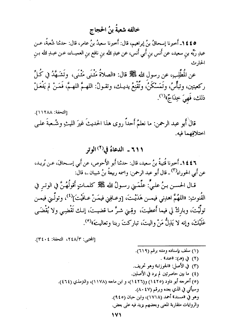 1446 - أَخْبَرَنَا قُتَيْبَةُ بْنُ سَعِيدٍ، قَالَ: حَدَّثَنَا أَبُو الْأَحْوَصِ، عَنْ أَبِي إِسْحَاقَ، عَنْ بُرَيْدٍ، عَنْ أَبِي الْحَوْرَاءِ - قَالَ أَبُو عَبْدِ الرَّحْمَنِ وَاسْمُهُ رَبِيعَةُ بْنُ شَيْبَانَ - قَالَ: قَالَ الْحَسَنُ بْنُ عَلِيٍّ: عَلَّمَنِي رَسُولُ اللهِ صَلَّى اللهُ عَلَيْهِ وَسَلَّمَ كَلِمَاتٍ أَقُولُهُنَّ فِي الْوِتْرِ فِي الْقُنُوتِ «§اللهُمَّ اهْدِنِي فِيمَنْ هَدَيْتَ، وَعَافِنِي فِيمَنْ عَافَيْتَ، وَتَوَلَّنِي فِيمَنْ تَوَلَّيْتَ، وَبَارِكْ لِي فِيمَا أَعْطَيْتَ، وَقِنِي شَرَّ مَا قَضَيْتَ، إِنَّكَ تَقْضِي وَلَا يُقْضَى عَلَيْكَ، وَإِنَّهُ لَا يَذِلُّ مَنْ وَالَيْتَ، تَبَارَكْتَ رَبَّنَا وَتَعَالَيْتَ»