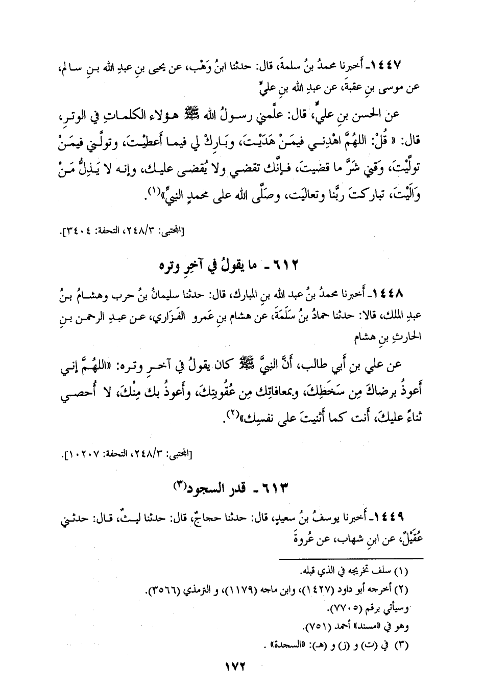 1448 - أَخْبَرَنَا مُحَمَّدُ بْنُ عَبْدِ اللهِ بْنِ الْمُبَارَكِ، قَالَ: حَدَّثَنَا سُلَيْمَانُ بْنُ حَرْبٍ، وَهِشَامُ بْنُ عَبْدِ الْمَلِكِ، قَالَا: حَدَّثَنَا حَمَّادُ بْنُ سَلَمَةَ، عَنْ هِشَامِ بْنِ عَمْرٍو الْفَزَارِيِّ، عَنْ عَبْدِ الرَّحْمَنِ بْنِ الْحَارِثِ بْنِ هِشَامٍ، عَنْ عَلِيِّ بْنِ أَبِي طَالِبٍ،: أَنَّ النَّبِيَّ صَلَّى اللهُ عَلَيْهِ وَسَلَّمَ كَانَ يَقُولُ فِي آخِرِ وِتْرِهِ «§اللهُمَّ إِنِّي أَعُوذُ بِرِضَاكَ مِنْ سَخَطِكَ وَبِمُعَافَاتِكَ مِنْ عُقُوبَتِكَ، وَأَعُوذُ بِكَ مِنْكَ، لَا أُحْصِي ثَنَاءً عَلَيْكَ، أَنْتَ كَمَا أَثْنَيْتَ عَلَى نَفْسِكَ»