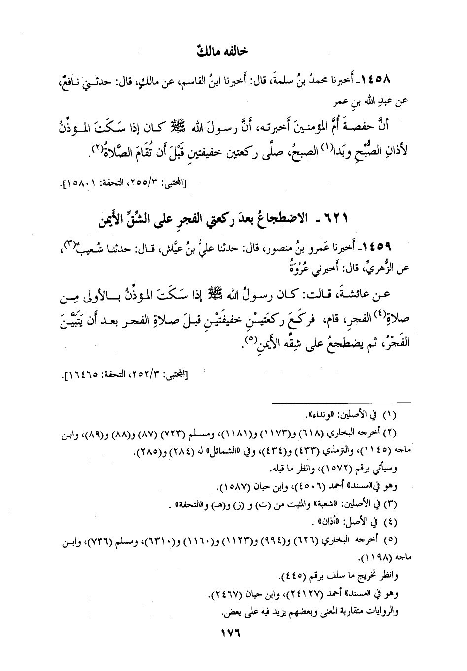 1458 - أَخْبَرَنَا مُحَمَّدُ بْنُ سَلَمَةَ، قَالَ: أَخْبَرَنَا ابْنُ الْقَاسِمِ، عَنْ مَالِكٍ، قَالَ: حَدَّثَنِي نَافِعٌ، عَنْ عَبْدِ اللهِ بْنِ عُمَرَ، أَنَّ حَفْصَةَ أُمَّ الْمُؤْمِنِينَ أَخْبَرَتْهُ: أَنَّ رَسُولَ اللهِ صَلَّى اللهُ عَلَيْهِ وَسَلَّمَ كَانَ «§إِذَا سَكَتَ الْمُؤَذِّنُ لِأَذَانِ الصُّبْحِ، وَبَدَا الصُّبْحُ، صَلَّى رَكْعَتَيْنِ خَفِيفَتَيْنِ، قَبْلَ أَنْ تُقَامَ الصَّلَاةُ»
