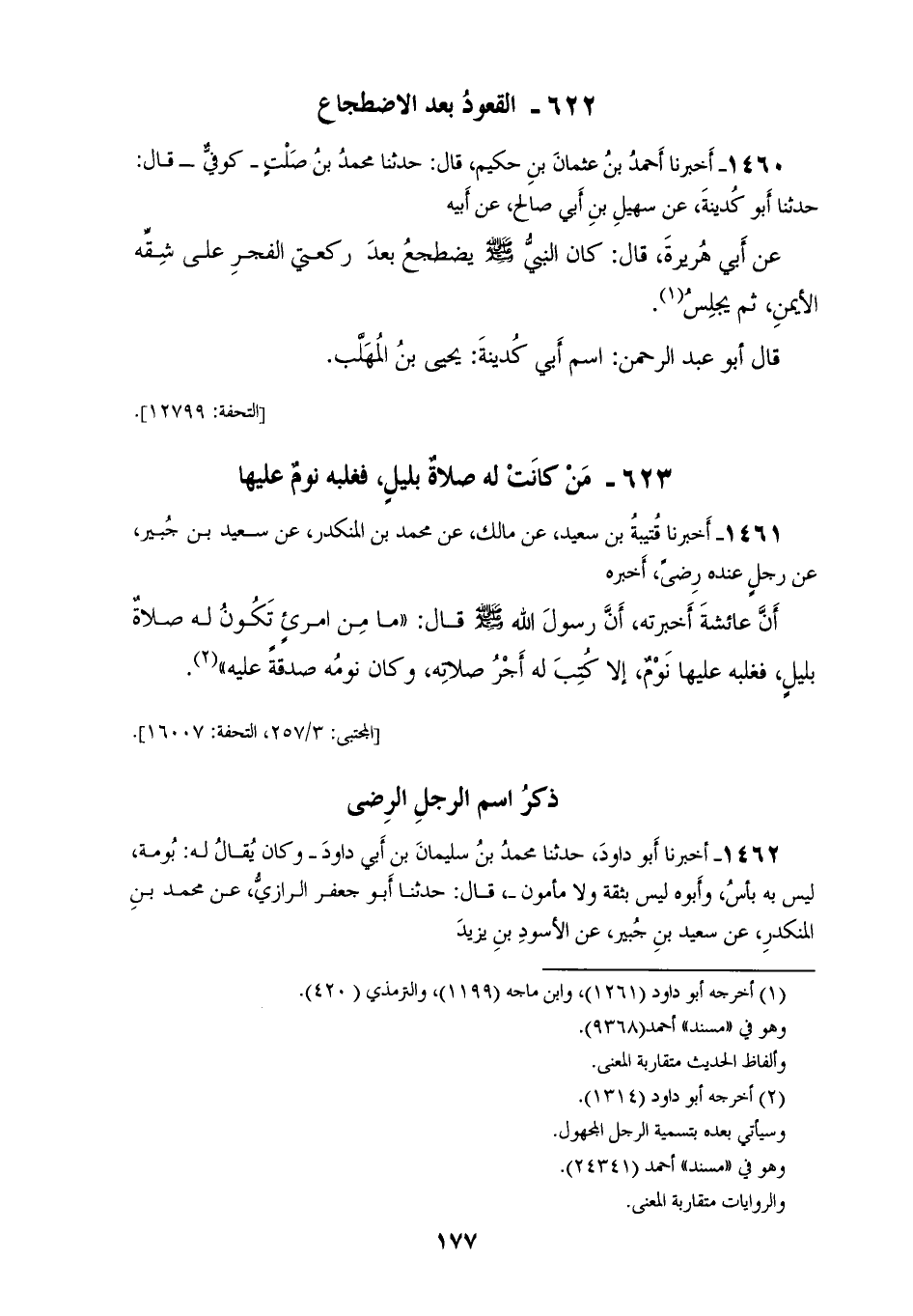 1460 - أَخْبَرَنَا أَحْمَدُ بْنُ عُثْمَانَ بْنِ حَكِيمٍ، قَالَ: حَدَّثَنَا مُحَمَّدُ بْنُ صَلْتٍ كُوفِيٌّ قَالَ: حَدَّثَنَا أَبُو كُدَيْنَةَ، عَنْ سُهَيْلِ بْنِ أَبِي صَالِحٍ، عَنْ أَبِيهِ، عَنْ أَبِي هُرَيْرَةَ قَالَ: كَانَ النَّبِيُّ صَلَّى اللهُ عَلَيْهِ وَسَلَّمَ «§يَضْطَجِعُ بَعْدَ رَكْعَتَيِ الْفَجْرِ عَلَى شِقِّهِ الْأَيْمَنِ» ثم يَجْلِسُ، قَالَ أَبُو عَبْدِ الرَّحْمَنِ: اسْمُ أَبِي كُدَيْنَةَ يَحْيَى بْنُ الْمُهَلَّبِ