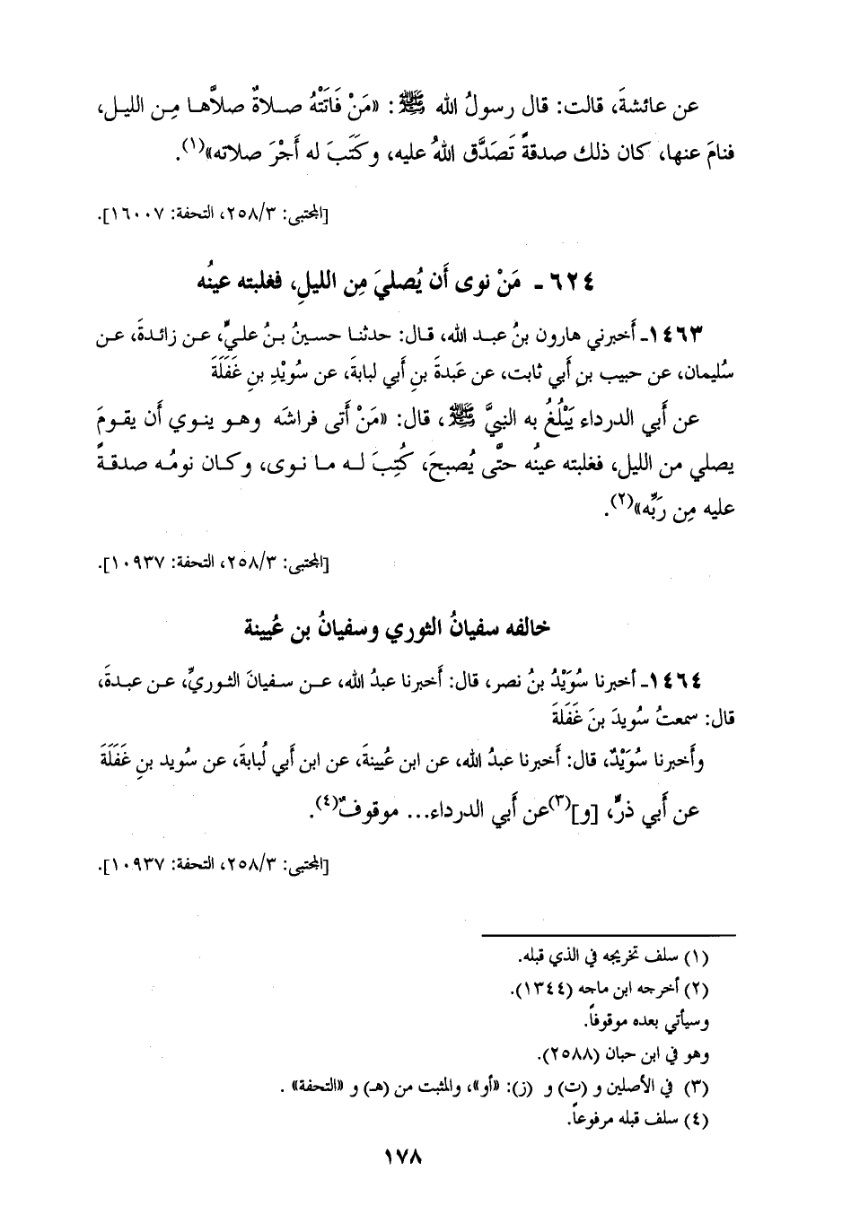 1463 - أَخْبَرَنِي هَارُونُ بْنُ عَبْدِ اللهِ، قَالَ: حَدَّثَنَا حُسَيْنُ بْنُ عَلِيٍّ، عَنْ زَائِدَةَ، عَنْ سُلَيْمَانَ، عَنْ حَبِيبِ بْنِ أَبِي ثَابِتٍ، عَنْ عَبْدَةَ بْنِ أَبِي لُبَابَةَ، عَنْ سُوَيْدِ بْنِ غَفَلَةَ، عَنْ أَبِي الدَّرْدَاءِ، يَبْلُغُ بِهِ النَّبِيَّ صَلَّى اللهُ عَلَيْهِ وَسَلَّمَ قَالَ: «§مَنْ أَتَى فِرَاشَهُ وَهُوَ يَنْوِي أَنْ يَقُومَ يُصَلِّيَ مِنَ اللَّيْلِ فَغَلَبَتْهُ عَيْنُهُ حَتَّى يُصْبِحَ، كُتِبَ لَهُ مَا نَوَى، وَكَانَ نَوْمُهُ صَدَقَةً عَلَيْهِ مِنْ رَبِّهِ» خَالَفَهُ سُفْيَانُ الثَّوْرِيُّ وَسُفْيَانُ بْنُ عُيَيْنَةَ