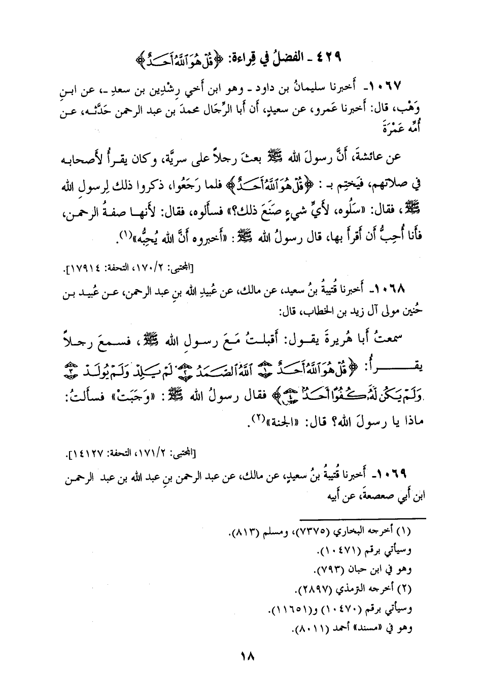 1068 - أَخْبَرَنَا قُتَيْبَةُ بْنُ سَعِيدٍ، عَنْ مَالِكٍ، عَنْ عُبَيْدِ اللهِ بْنِ عَبْدِ الرَّحْمَنِ، عَنْ عُبَيْدِ بْنِ حُنَيْنٍ، مَوْلَى آلِ زَيْدِ بْنِ الْخَطَّابِ قَالَ: سَمِعْتُ أَبَا هُرَيْرَةَ يَقُولُ: أَقْبَلْتُ مَعَ رَسُولِ اللهِ صَلَّى اللهُ عَلَيْهِ وَسَلَّمَ، فَسَمِعَ رَجُلًا يَقْرَأُ {قُلْ هُوَ اللهُ أَحَدٌ. اللهُ الصَّمَدُ. لَمْ يَلِدْ وَلَمْ يُولَدْ. وَلَمْ يَكُنْ لَهُ كُفُوًا أَحَدٌ} [الإخلاص: 2] فَقَالَ رَسُولُ اللهِ صَلَّى اللهُ عَلَيْهِ وَسَلَّمَ: «§وَجَبَتْ» فَسَأَلْتُ: مَاذَا يَا رَسُولَ اللهِ؟ قَالَ: «الْجَنَّةُ»