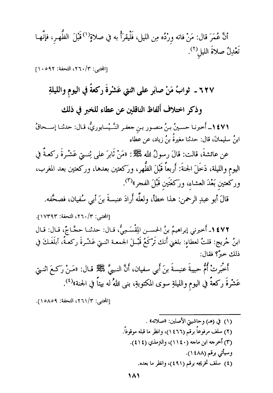 1471 - أَخْبَرَنَا حُسَيْنُ بْنُ مَنْصُورِ بْنِ جَعْفَرٍ النَّيْسَابُورِيُّ، قَالَ: حَدَّثَنَا إِسْحَاقُ بْنُ سُلَيْمَانَ، قَالَ: حَدَّثَنَا مُغِيرَةُ بْنُ زِيَادٍ، عَنْ عَطَاءٍ، عَنْ عَائِشَةَ، قَالَتْ: قَالَ رَسُولُ اللهِ صَلَّى اللهُ عَلَيْهِ وَسَلَّمَ «§مَنْ ثَابَرَ عَلَى ثِنْتَيْ عَشْرَةَ رَكْعَةً فِي الْيَوْمِ وَاللَّيْلَةِ، دَخَلَ الْجَنَّةَ أَرْبَعًا قَبْلَ الظُّهْرِ، وَرَكْعَتَيْنِ بَعْدَهَا، وَرَكْعَتَيْنِ بَعْدَ الْمَغْرِبِ، وَرَكْعَتَيْنِ بَعْدَ الْعِشَاءِ، وَرَكْعَتَيْنِ قَبْلَ الْفَجْرِ» قَالَ أَبُو عَبْدِ الرَّحْمَنِ: هَذَا خَطَأٌ وَلَعَلَّهُ أَرَادَ عَنْبَسَةَ بْنَ أَبِي سُفْيَانَ فَصَحَّفَهُ