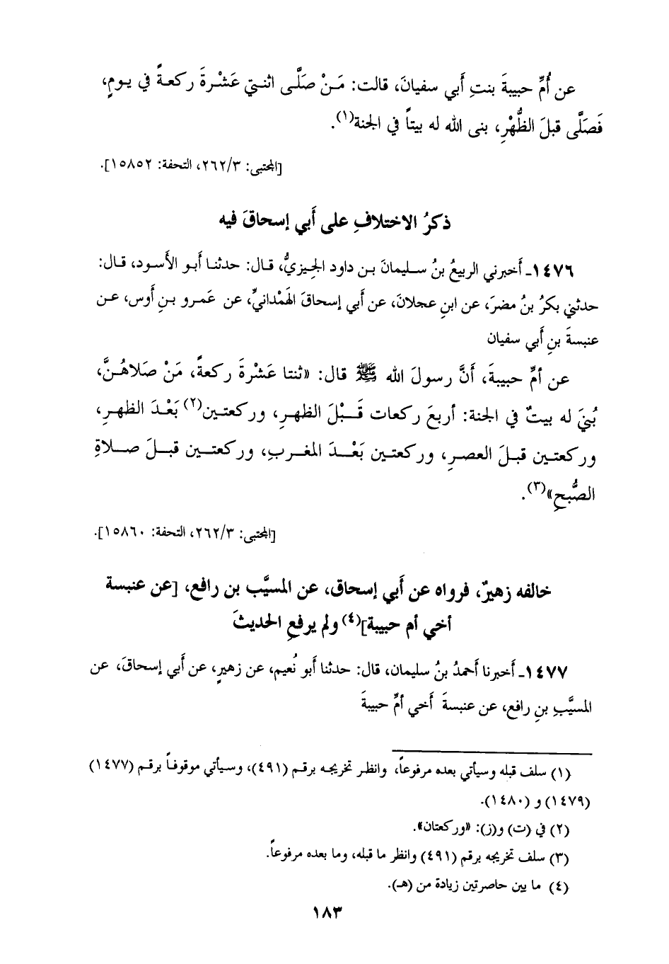 1476 - أَخْبَرَنِي الرَّبِيعُ بْنُ سُلَيْمَانَ بْنِ دَاوُدَ الْجِيزِيُّ، قَالَ: حَدَّثَنَا أَبُو الْأَسْوَدِ، قَالَ: حَدَّثَنِي بَكْرُ بْنُ مُضَرَ، عَنِ ابْنِ عَجْلَانَ، عَنْ أَبِي إِسْحَاقَ الْهَمْدَانِيِّ، عَنْ عَمْرِو بْنِ أَوْسٍ، عَنْ عَنْبَسَةَ بْنِ أَبِي سُفْيَانَ، عَنْ أُمِّ حَبِيبَةَ أَنَّ رَسُولَ اللهِ صَلَّى اللهُ عَلَيْهِ وَسَلَّمَ قَالَ: «§ثِنْتَا عَشْرَةَ رَكْعَةً مَنْ صَلَّاهُنَّ، بُنِيَ لَهُ بَيْتٌ فِي الْجَنَّةِ، أَرْبَعُ رَكَعَاتٍ قَبْلَ الظُّهْرِ، وَرَكْعَتَانِ بَعْدَ الظُّهْرِ، وَرَكْعَتَانِ قَبْلَ الْعَصْرِ، وَرَكْعَتَانِ بَعْدَ الْمَغْرِبِ، وَرَكْعَتَانِ قَبْلَ صَلَاةِ الصُّبْحِ» خَالَفَهُ زُهَيْرٌ فَرَوَاهُ عَنْ أَبِي إِسْحَاقَ، عَنِ الْمُسَيَّبِ بْنِ رَافِعٍ عَنْ عَنْبَسَةَ أَخِي أُمِّ حَبِيبَةَ وَلَمْ يَرْفَعِ الْحَدِيثَ