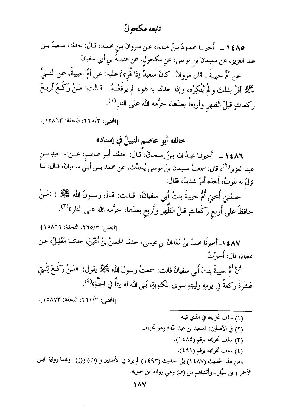 1485 - أَخْبَرَنِي مَحْمُودُ بْنُ خَالِدٍ، عَنْ مَرْوَانَ بْنِ مُحَمَّدٍ، قَالَ: حَدَّثَنَا سَعِيدُ بْنُ عَبْدِ الْعَزِيزِ، عَنْ سُلَيْمَانَ بْنِ مُوسَى، عَنْ مَكْحُولٍ، عَنْ عَنْبَسَةَ بْنِ أَبِي سُفْيَانَ، عَنْ أُمِّ حَبِيبَةَ. قَالَ مَرْوَانُ: كَانَ سَعِيدٌ إِذَا قُرِئَ عَلَيْهِ، عَنْ أُمِّ حَبِيبَةَ، عَنِ النَّبِيِّ صَلَّى اللهُ عَلَيْهِ وَسَلَّمَ أَقَرَّ بِذَلِكَ وَلَمْ يُنْكِرْهُ، وَإِذَا حَدَّثَنَا بِهِ، هُوَ لَمْ يَرْفَعْهُ، قَالَتْ: «§مَنْ رَكَعَ أَرْبَعَ رَكَعَاتٍ قَبْلَ الظُّهْرِ، وَأَرْبَعًا بَعْدَهَا حَرَّمَهُ اللهُ عَلَى النَّارِ» خَالَفَهُ أَبُو عَاصِمٍ النَّبِيلُ فِي إِسْنَادِهِ