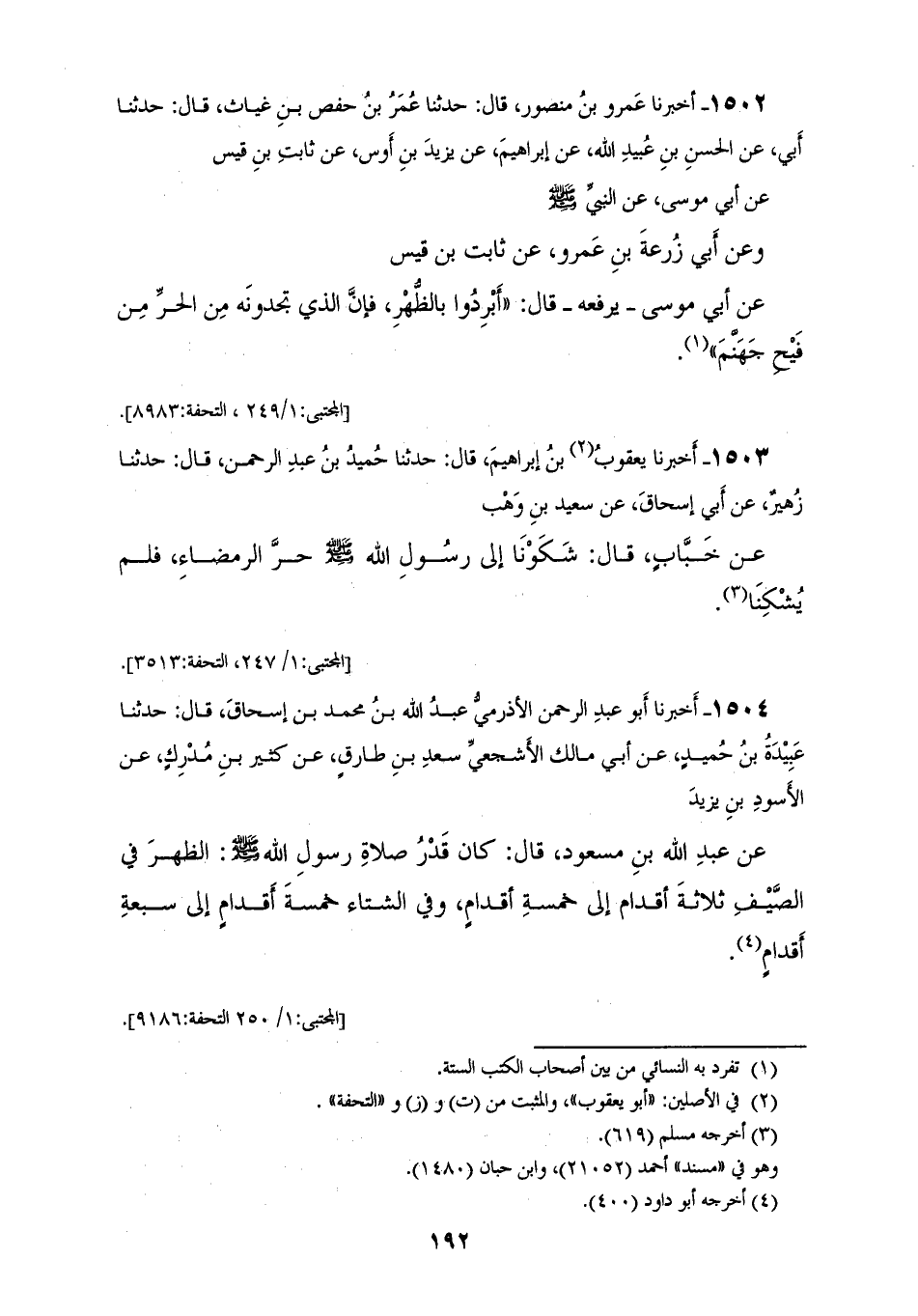 1504 - أَخْبَرَنَا أَبُو عَبْدِ الرَّحْمَنِ الْأَذْرَمِيُّ عَبْدُ اللهِ بْنُ مُحَمَّدِ بْنِ إِسْحَاقَ، قَالَ: حَدَّثَنَا عَبِيدَةُ بْنُ حُمَيْدٍ، عَنْ أَبِي مَالِكٍ الْأَشْجَعِيِّ سَعْدِ بْنِ طَارِقٍ، عَنْ كَثِيرِ بْنِ مُدْرِكٍ، عَنِ الْأَسْوَدِ بْنِ يَزِيدَ، عَنْ عَبْدِ اللهِ بْنِ مَسْعُودٍ قَالَ: كَانَ «§قَدْرُ صَلَاةِ رَسُولِ اللهِ صَلَّى اللهُ عَلَيْهِ وَسَلَّمَ الظُّهْرَ فِي الصَّيْفِ ثَلَاثَةَ أَقْدَامٍ إِلَى خَمْسَةِ أَقْدَامٍ، وَفِي الشِّتَاءِ خَمْسَةَ أَقْدَامٍ إِلَى سَبْعَةِ أَقْدَامٍ»